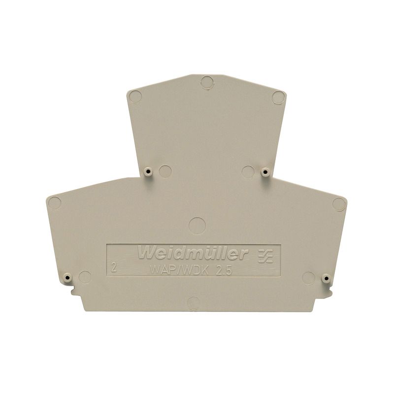 Abschlussplatte für den Berührungsschutz an spannungsführenden Teilen von Reihenklemmen. Die Abschlussplatte wird auch zur optisch erkennbaren Trennung von Stromkreisen eingesetzt, um Verdrahtungsfehler zu vermeiden.