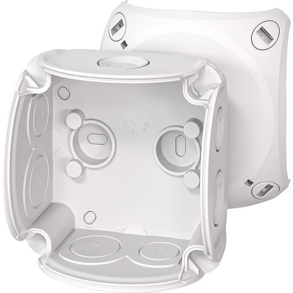 Kabelabzweigkasten aus hochwertigem Thermoplast. Für Aufputz-Anwendungen in Gebäuden oder die geschützte Installation im Freien. Mit Außenlaschen zur Befestigung und Deckelbefestigung über Schnellverschlüsse. Kabelabzweigkasten ohne Klemmen. Kabeleinführung über elastische Dichtmembranen in Gehäusewänden und Boden. Nachträglicher Einsatz von Kabelstutzen durch Entfernen der Dichtmembrane möglich. Mit Deckelhalteband.