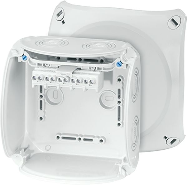 Kabelabzweigkasten aus hochwertigem Thermoplast für die ungeschützte Installation im Freien oder Aufputz-Anwendungen in Gebäuden. Beständig gegen Witterungseinflüsse wie UV-Belastung durch Sonneneinstrahlung, geschützt gegen Regenwasser, temperaturbeständig und schlagfest. Deckelbefestigung über Schnellverschlüsse. Mit Außenlaschen zur Befestigung. Seewasserbeständig, für Offshore-Anwendungen. Mit Zulassung für die Installation auf Schiffen. Klemme mit 2 Klemmstellen je Pol bis 4 mm², 5-polig. Kabeleinführung über metrische Vorprägungen. Anbau-Kabelstutzen im Zubehör. Mit Deckelhalteband.