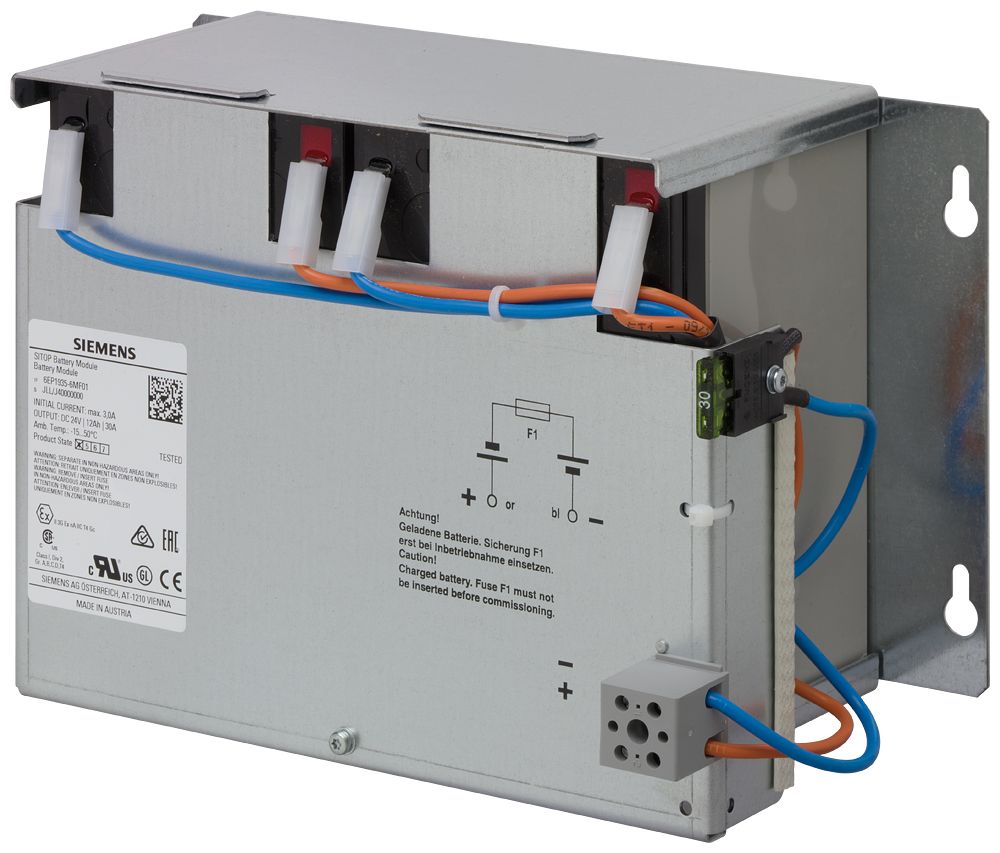 SITOP Akkumodul 24 V/7 Ah mit wartungsfreien, verschlossenen Bleiakkus fuer SITOP DC-USV-Modul 6 A, 15 A und 40 A Die wartungsfreien Batteriemodule mit Bleiakkus sind ein wichtiger Bestandteil der DC-USV-Systeme. In Kombination mit einer 24-V-Stromversorgung und einem DC-USV Modul ermöglichen sie die Pufferung von Netzausfällen bis in den Stundenbereich. Für längere Pufferzeiten können bis zu sechs Batteriemodule parallel geschaltet werden. Die Batteriemodule sind komplett vorverdrahtet mit Batteriesicherungshalter und Anschlussklemmen. Die Befestigung erfolgt auf Normprofilschiene oder durch direkte Wandmontage.