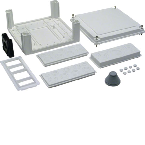 Der Einspeise-/Kabelanschlusskasten univers, Maße 324x307x149mm, bietet einen Schutzgrad von IP54 und gehört zur Schutzklasse II. Als leerer Kasten konzipiert, ermöglicht er flexible Erweiterungsmöglichkeiten für diverse Anwendungen. Ideal für sichere und geschützte Kabelverbindungen in Umgebungen mit Staub- und Spritzwasserschutz.