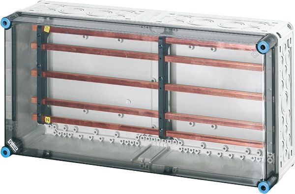 Gehäuse für den Bau von Energie-Schaltgerätekombinationen bis 630 A oder als Einzelgehäuse. Aus hochwertigem Polycarbonat schutzisoliert. Wanddurchführungen mit großen Öffnungen für die elektrische Verbindung der Gehäuse untereinander. Kabeleinführung an allen Gehäusewänden über metrische Vorprägungen oder Anbauflansche. Gehäuse zur Wandbefestigung auch über Außenlaschen oder mit Montageschienen. Automatengehäuse mit 36 Teilungseinheiten zum Einbau von Reiheneinbaugeräten nach DIN 43880. Ohne PE- und N-Klemmen. Mit Abdeckstreifen zum Verschließen von nicht benutzten Geräteausschnitten und Beschriftungsstreifen für die Stromkreiskennzeichnung. Transparenter Deckel, Deckelverschlüsse für Handbetätigung.