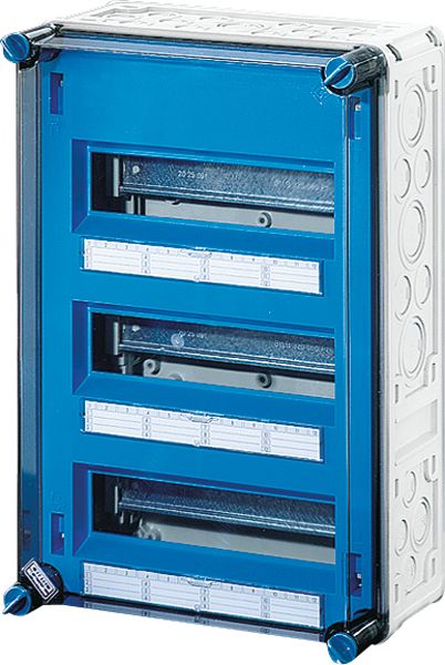 Gehäuse für den Bau von Energie-Schaltgerätekombinationen bis 630 A oder als Einzelgehäuse. Aus hochwertigem Polycarbonat schutzisoliert. Wanddurchführungen mit großen Öffnungen für die elektrische Verbindung der Gehäuse untereinander. Kabeleinführung an allen Gehäusewänden über metrische Vorprägungen oder Anbauflansche. Gehäuse zur Wandbefestigung auch über Außenlaschen oder mit Montageschienen. Automatengehäuse mit 48 Teilungseinheiten zum Einbau von Reiheneinbaugeräten nach DIN 43880. Mit PE- und N-Klemmen für Kupferleiter. N trennbar für unterschiedliche Potenziale. Mit Abdeckstreifen zum Verschließen von nicht benutzten Geräteausschnitten und Beschriftungsstreifen für die Stromkreiskennzeichnung. Transparenter Deckel, Deckelverschlüsse für Handbetätigung.