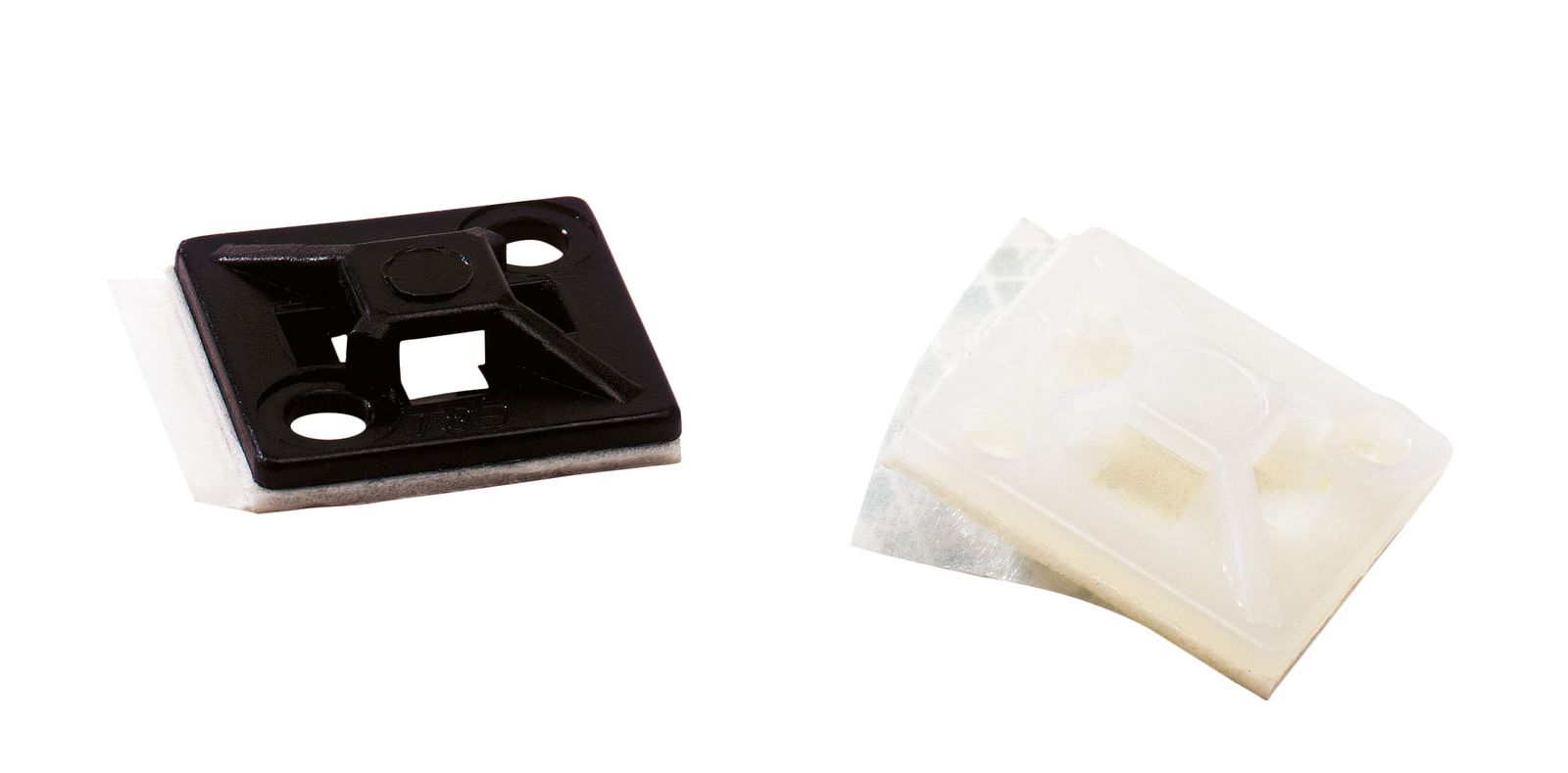 Der Befestigungssockel mit zwei Eingängen ist in vier Materialvariationen lieferbar. Diese sind naturfarbenes Standard Polyamid 6.6, schwarz UV-beständiges Polyamid 6.6, flammwidriges Polyamid 6.6 und das hochqualitative ETFE Fluoropolymer (aquamarinblau) zum Einsatz bei extremen Bedingungen. Er ist verfügbar mit schaumbeschichteter Klebefläche aus synthetischem Polymer, ohne Selbstklebefläche zum Anschrauben oder zum Kleben mit 2-Komponentenkleber. Der leistungsstarke Befestigungssockel vervollständigt die Produktpalette unserer zuverlässigen Premium-Kabelbinder und deckt die am häufigsten angefragten Anwendungsmöglichkeiten im Kabelmanagement ab.