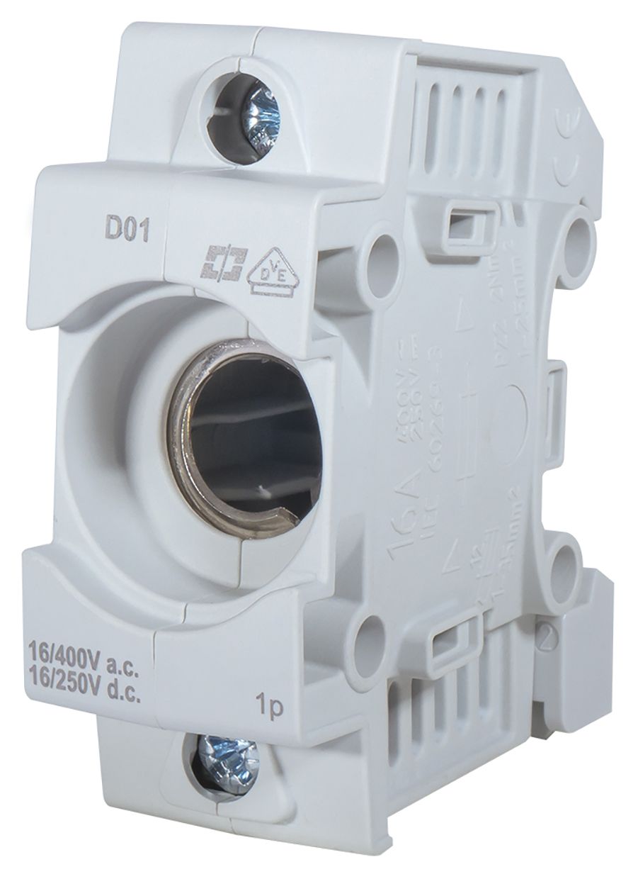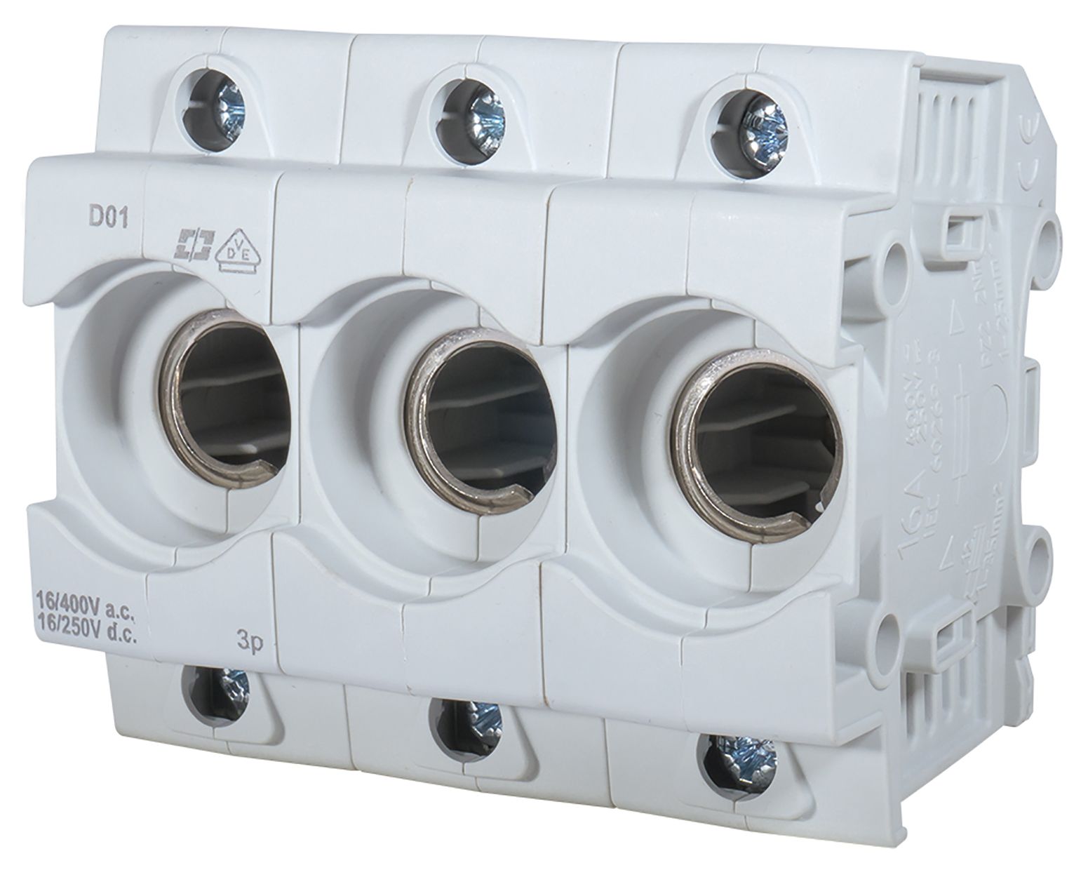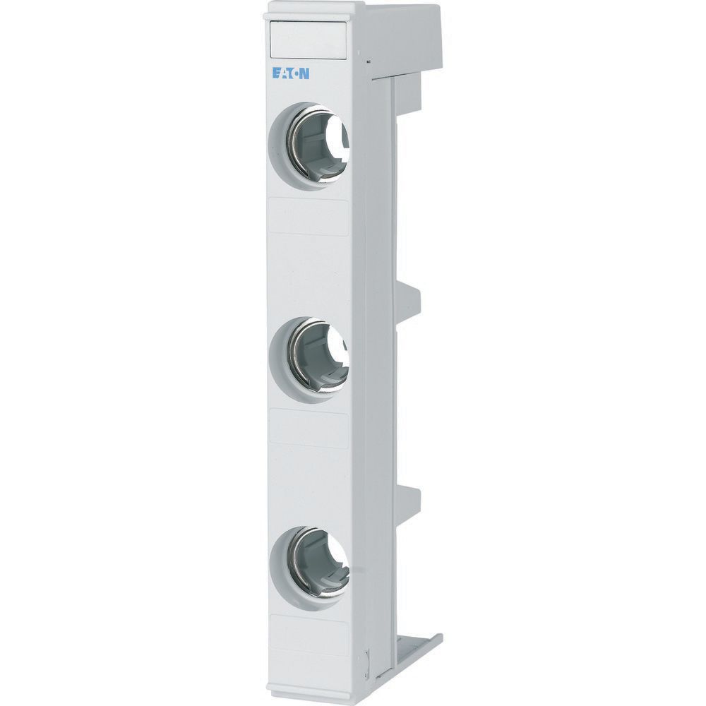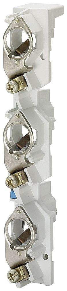 D0-Sicherungssockel, kompaktes Kunststoffgehäuse, schieberlose integrierte Abdeckung (zeitsparende Montage), Doppelkastenklemme am Eingang (1-35mm² / 16 mm²), gleichzeitiger Anschluss von Kabel und isolierter Sammelschiene möglich, niedrige Verlustleistung, Berührungsschutz nach BGV A3, Sicherungssockel 3-polig: 4,5 Teilungseinheiten (TE).