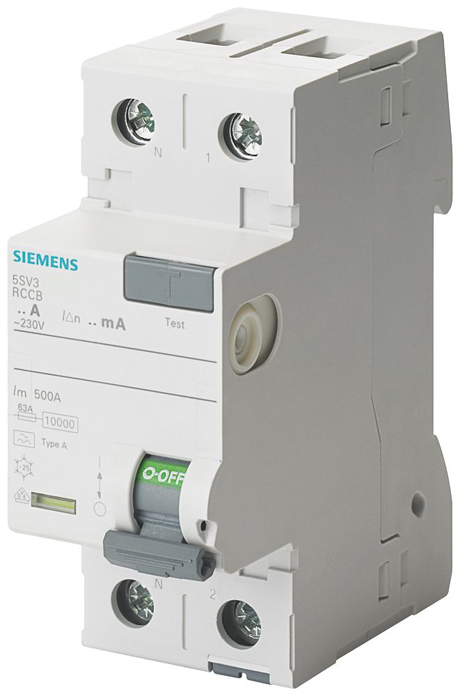 FI-Schutzschalter, 2-polig, Typ A, In: 25 A, 30 mA, Un AC: 230 V, N-links Fehlerstromschutzschalter SENTRON 5SV3 für den umfassenden Schutz für Personen und Sachwerte vor elektrischem Schlag. Die FI-Schutzschalter bieten zuverlässige Sicherheit bei der Installation durch den standardmäßig enthaltenen Umgreif- und Berührungsschutz. Mit der komfortablen Schieber-Hand-Betätigung können Sie die FI-Schutzschalter werkzeuglos von der Hutschiene bzw. aus dem Sammelschienenverbund lösen. Über den Datamatrix-Code am Gerät erhalten Sie schnellen Zugang zu allen technischen Daten in der Siemens Industry Online Support App. Die SENTRON Schutzschaltgeräte können mit dem durchgängigen Zubehör aus dem Systembaukasten um viele Funktionen erweitert werden. Optimale Technik für