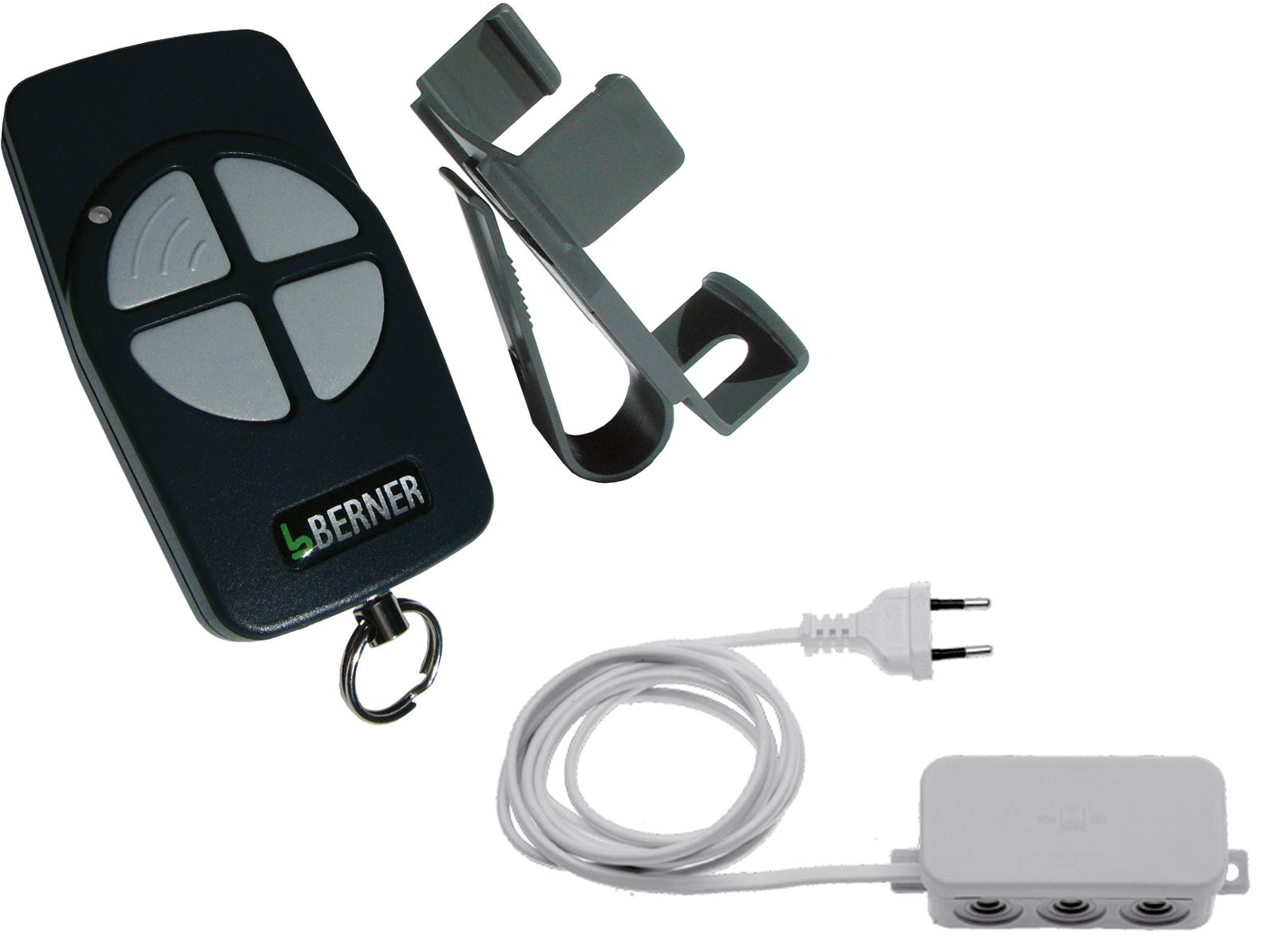 Midi-Handsender 868 MHz Festcode, 4-Kanal, inkl. Ringöse, Wandhalterung und Klipphalterung für Sonnenblende im Fahrzeug, mit blauer LED, Batterie CR2032, Maße (BxHxT): 40x70x14 mm