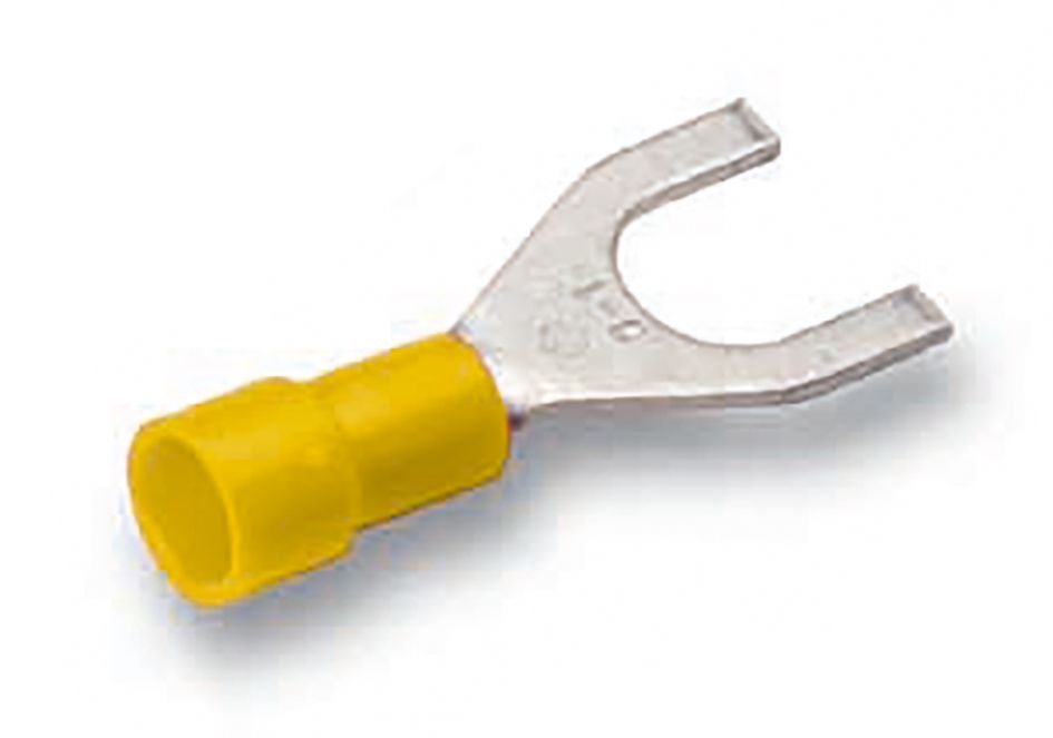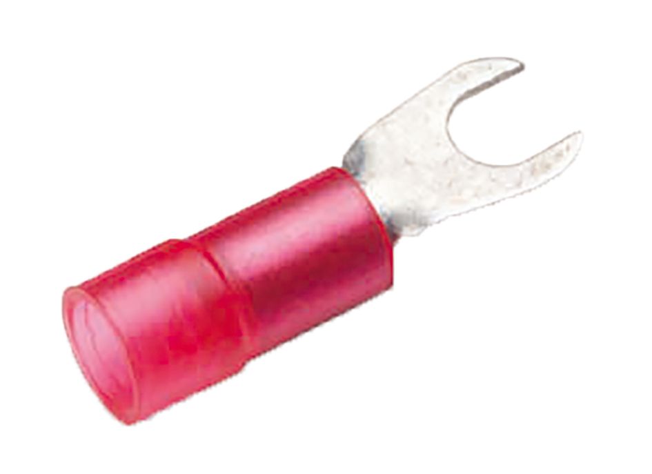 Quetschkabelschuhe, isoliert, Gabelform Cu, DIN 46237. Technische Daten - Werkstoff: Cu-ETP DIN EN 13600 - Oberfläche: galvanisch verzinnt. Für zugentlastete Verbindungen, Isolation PA (Polyamid, Nylon), halogenfrei. Temperaturbeständigkeit -60°C bis +105°C. Geeignet für fein- und mehrdrähtige Leiter. Easy Entry ermöglicht einfaches und schnelles Einführen des Leiters.