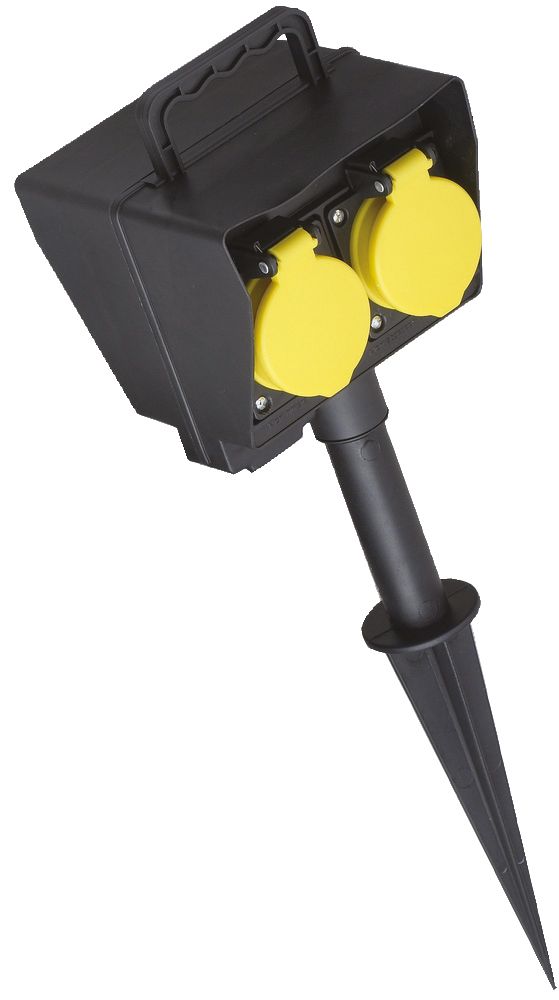 Gartensteckdose in schwarz, Schutzkontakt-Steckdosen mit Klappdeckel in gelb. Leitungstyp: H07RN-F 3G1,5 mm². 230 V/ 16 A/ 3600 W. Maße: Höhe gesamt 40 cm, Höhe Spieß 17 cm.