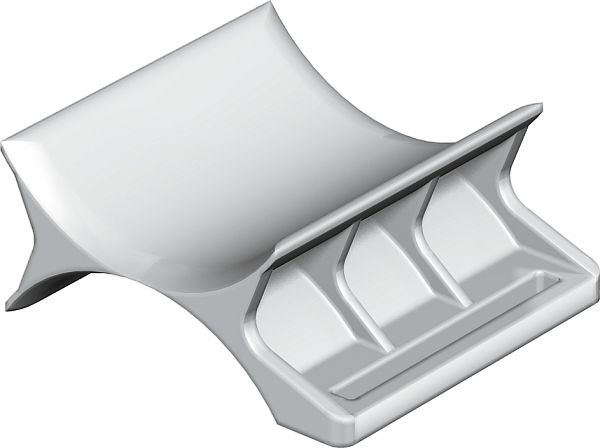 Unabhängig von der Schiene, universell einsetzbar durch Aufschieben auf einen Schenkel der Bügelschelle. Durch eine intelligente Kontur auf der Rückseite, kombinierbar zur Doppelwanne. Nachträgliche Installation ohne Demontage der Bügelschelle möglich.