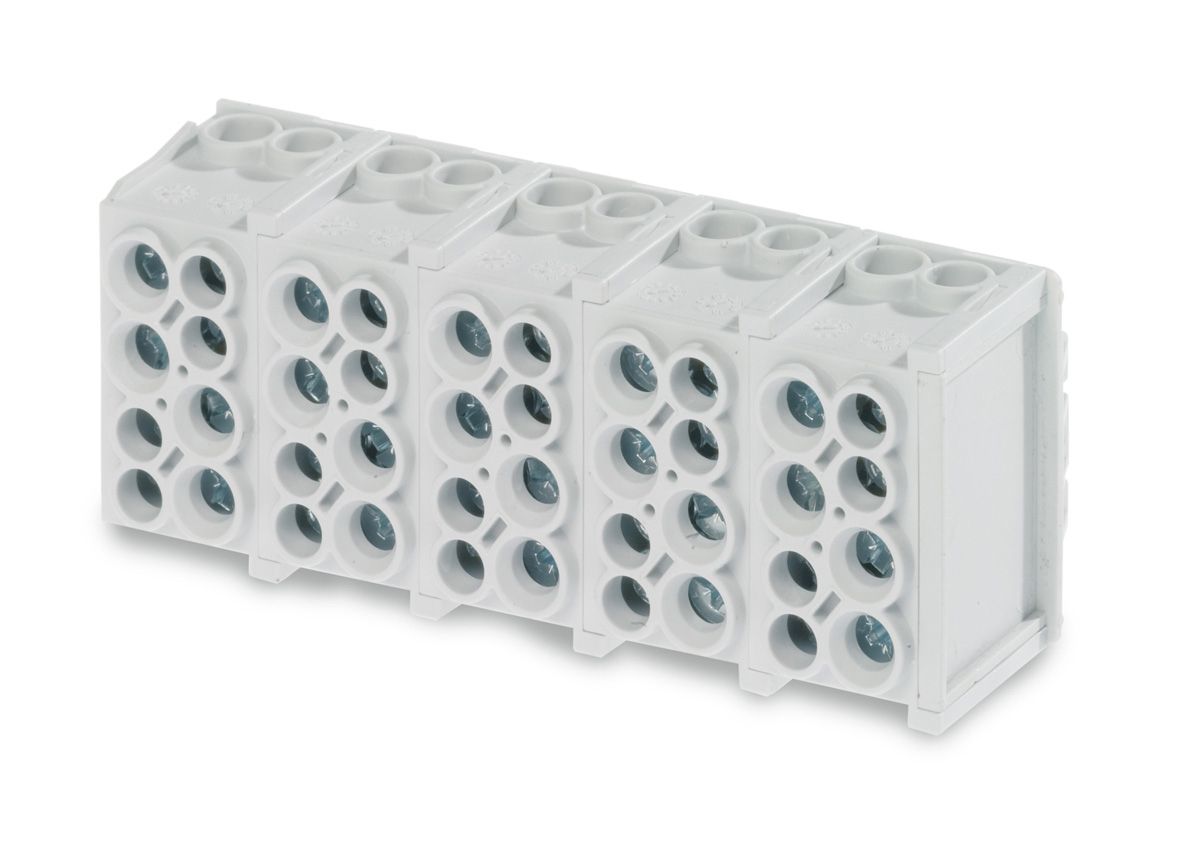 Hauptleitungsklemme, Eingänge 35 mm² / Ausgänge 25 mm², Ausführung C, allseitig fingersicher, AC 400 V, VDE zertifiziert, für Tragschienen 35 mm, nach DIN 50022. Befestigung durch einfaches Aufclipsen. Doppel-Schnellbefestigung aus Stahlblech. Minimodular kompatibel. Aufbau: Klemmkörper Messing verzinnt, Klemmschrauben Stahl verzinkt, Isoliergehäuse Kunststoff schlagzäh, flammgeschützt, halogenfrei. Für Aluminiumleiter (eindrähtig) geeignet. Die angegebenen Querschnitte beziehen sich auf ein oder mehrdrähtige Leiter. Für feindrähtige Leiter mit Aderendhülsen ist der nächstkleinere Querschnitt zu wählen.