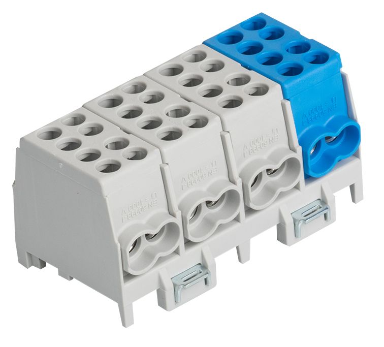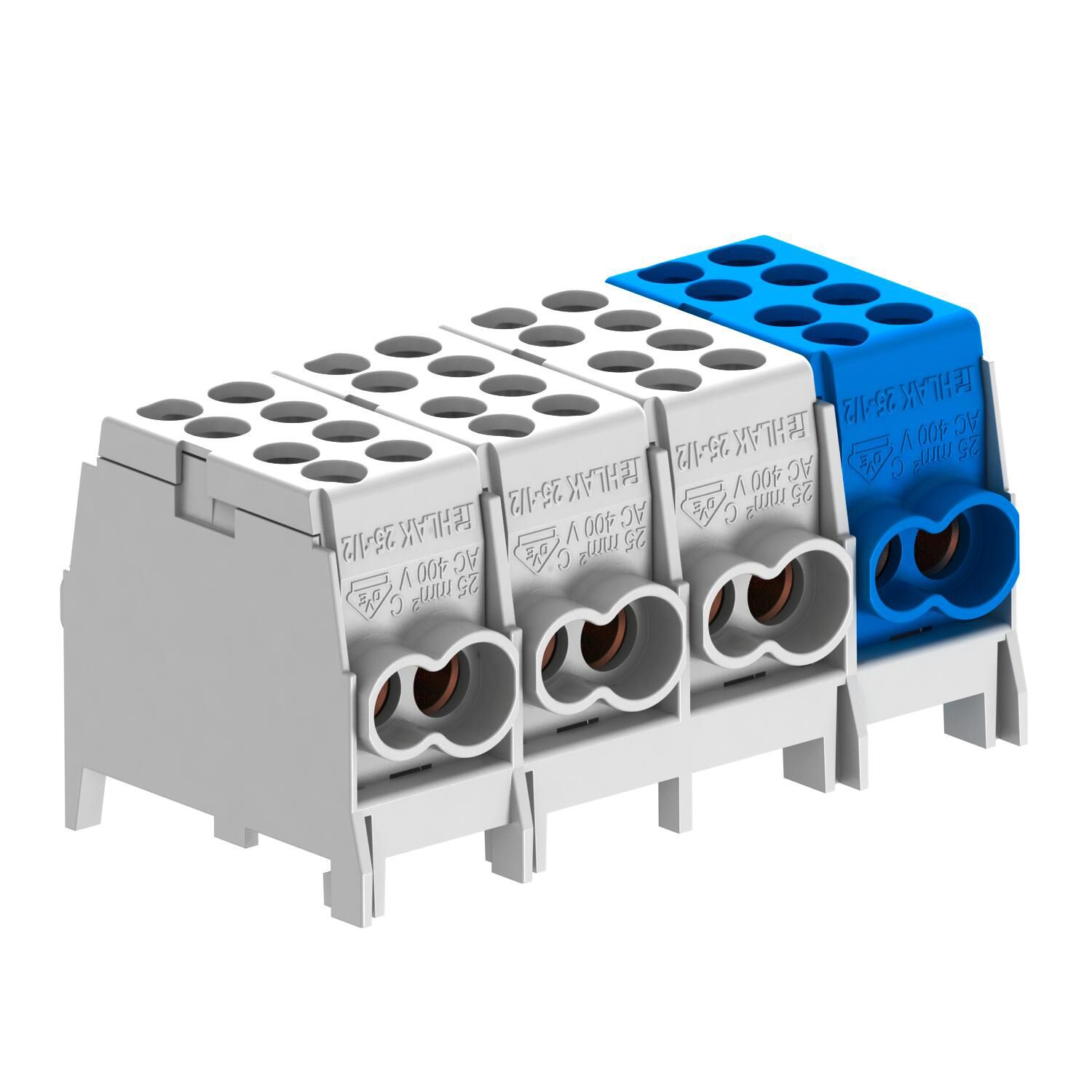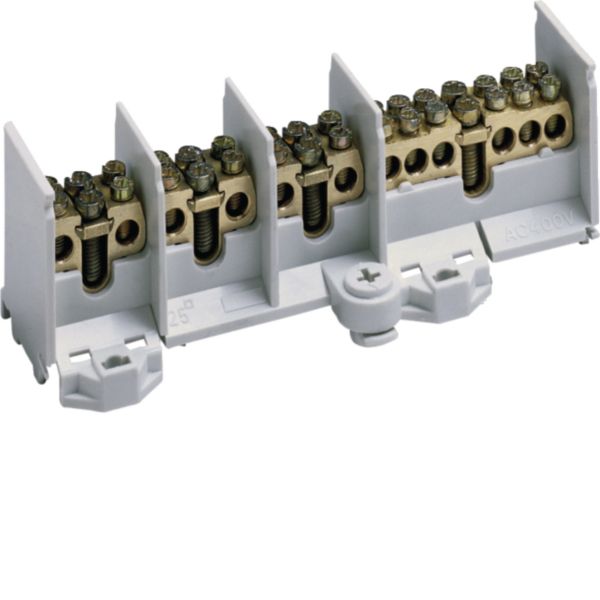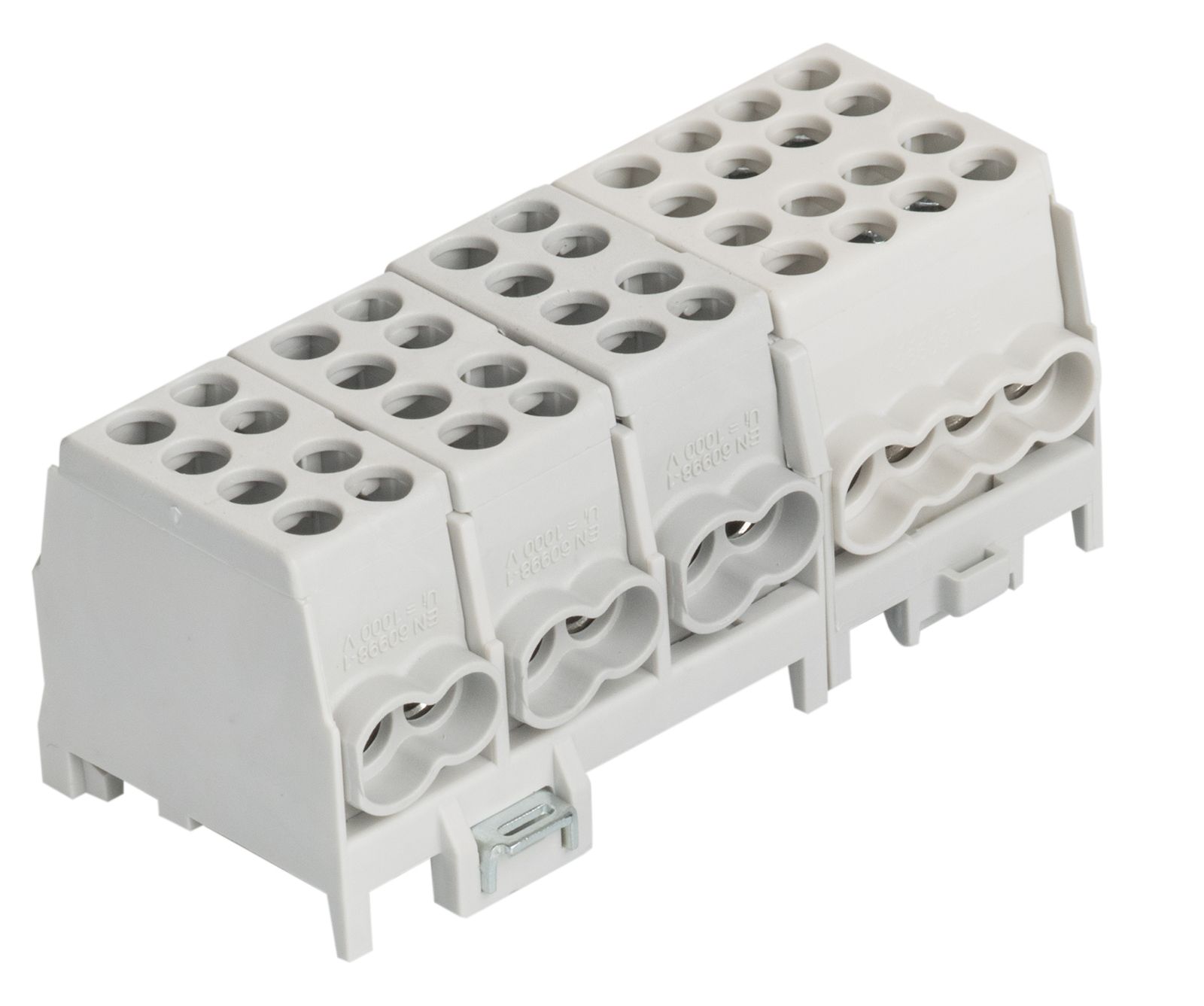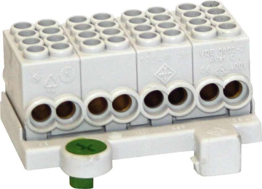 Hauptleitungsklemme, Eingänge 25 mm² / Ausgänge 16 mm², Ausführung C, allseitig fingersicher, AC 400 V, VDE zertifiziert, für Tragschienen 35 mm, nach DIN 50022. Befestigung durch einfaches Aufclipsen. Doppel-Schnellbefestigung aus Stahlblech. Minimodular kompatibel. Aufbau: Klemmkörper Messing verzinnt, Klemmschrauben Stahl verzinkt, Isoliergehäuse Kunststoff schlagzäh, flammgeschützt, halogenfrei. Für Aluminiumleiter (eindrähtig) geeignet. Die angegebenen Querschnitte beziehen sich auf ein oder mehrdrähtige Leiter. Für feindrähtige Leiter mit Aderendhülsen ist der nächstkleinere Querschnitt zu wählen.