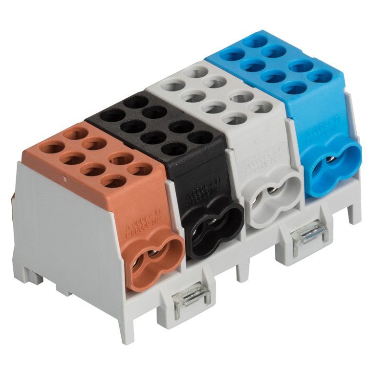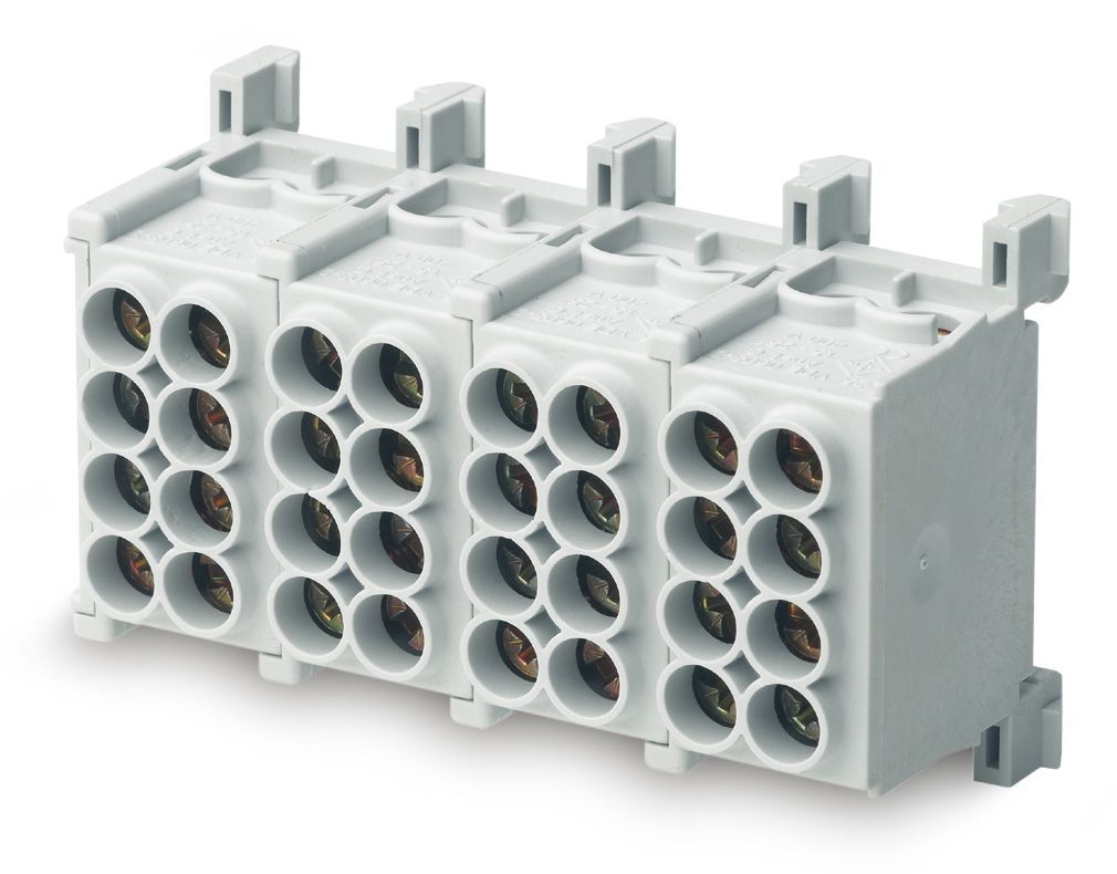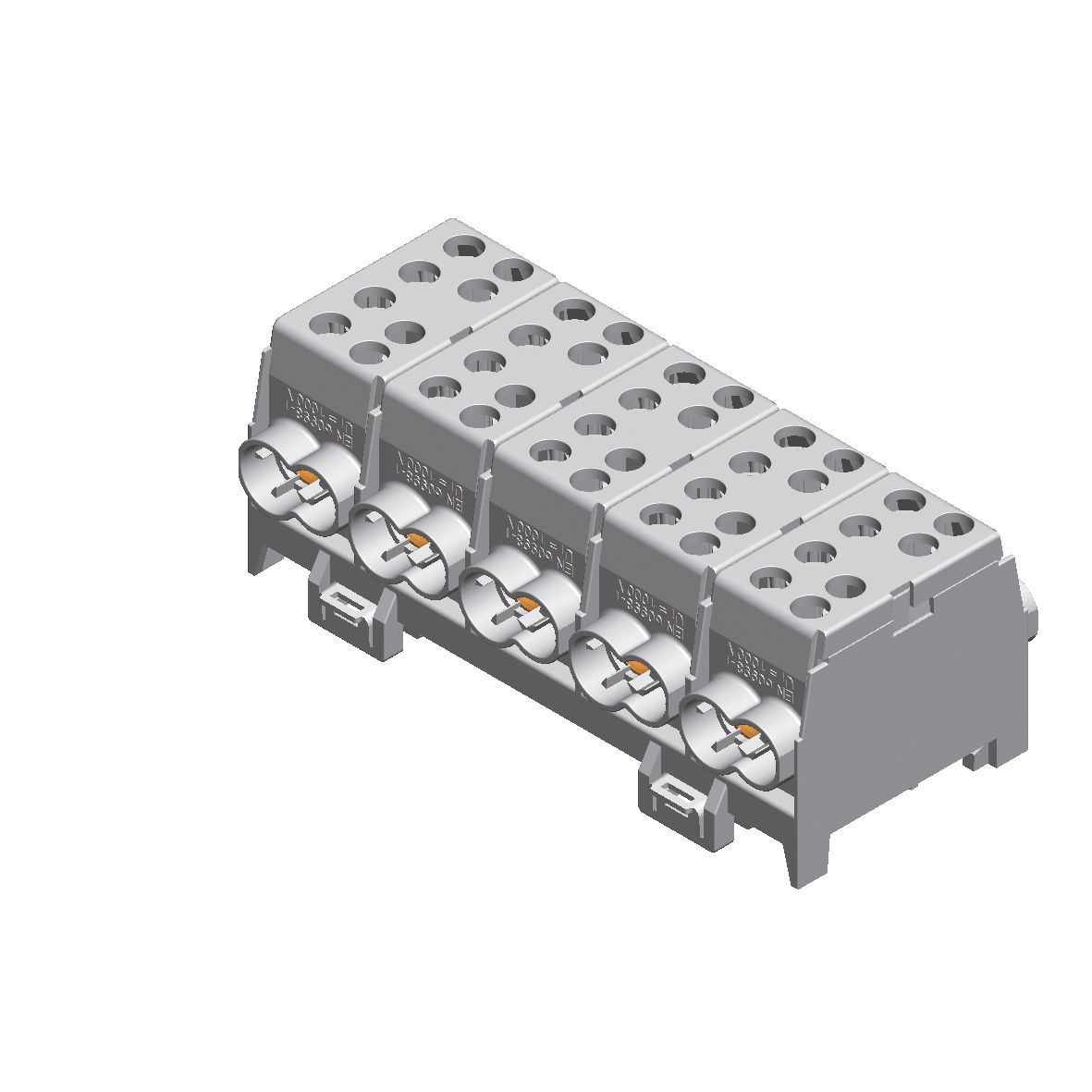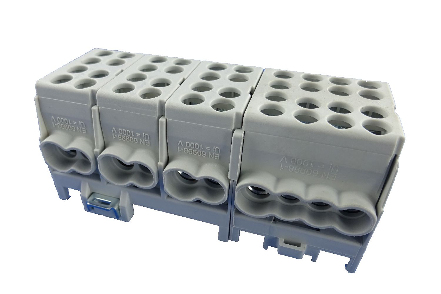 Hauptleitungsklemme, Eingänge 25 mm² / Ausgänge 16 mm², Ausführung C, allseitig fingersicher, AC 400 V, VDE zertifiziert, für Tragschienen 35 mm, nach DIN 50022. Befestigung durch einfaches Aufclipsen. Doppel-Schnellbefestigung aus Stahlblech. Minimodular kompatibel. Aufbau: Klemmkörper Messing verzinnt, Klemmschrauben Stahl verzinkt, Isoliergehäuse Kunststoff schlagzäh, flammgeschützt, halogenfrei. Für Aluminiumleiter (eindrähtig) geeignet. Die angegebenen Querschnitte beziehen sich auf ein oder mehrdrähtige Leiter. Für feindrähtige Leiter mit Aderendhülsen ist der nächstkleinere Querschnitt zu wählen.