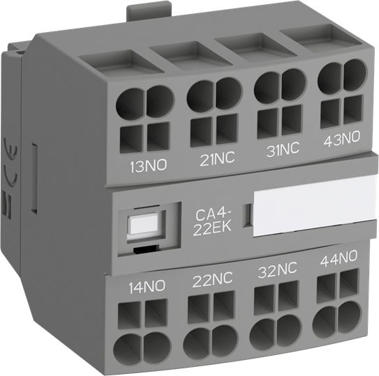 Die Hilfskontaktblöcke werden bei der Schaltung von Hilfsstromkreisen und Steuerstromkreisen in Standardindustrieumgebungen eingesetzt. Typen von Hilfskontaktblöcken für frontseitige Montage: CA4 1 oder 4-poliger Block mit Sofort-Schließer- und Öffnerkontakten CC4 1-poliger Block, mit voreilendem Schließer und nacheilendem Öffner CAT4 2-poliger Block mit 1-Sofort-Schließer- und 1-Öffnerkontakt und Anschluss für A1 / A2 Spulenklemmen vorn. Wählen Sie die Art der 4-poligen CA4-..E, CA4-..M, CA4-..U oder CA4-..N Hilfskontaktblöcke für den jeweiligen Schütz- oder Hilfsschütztyp anhand der Standardanforderungen (siehe Kennzeichnung und Lage der Anschlussklemmen). Typen von Hilfskontaktblöcken für seitliche Montage: CAL4 2-poliger Block mit Sofort-Schließer- und Öffnerkontakten. Zum Anbau auf der rechten bzw. linken Seite des Schützes. Die Hilfskontaktblöcke mit im Lieferzustand offenen Schraubklemmen sind gegen versehentliches Berühren geschützt und