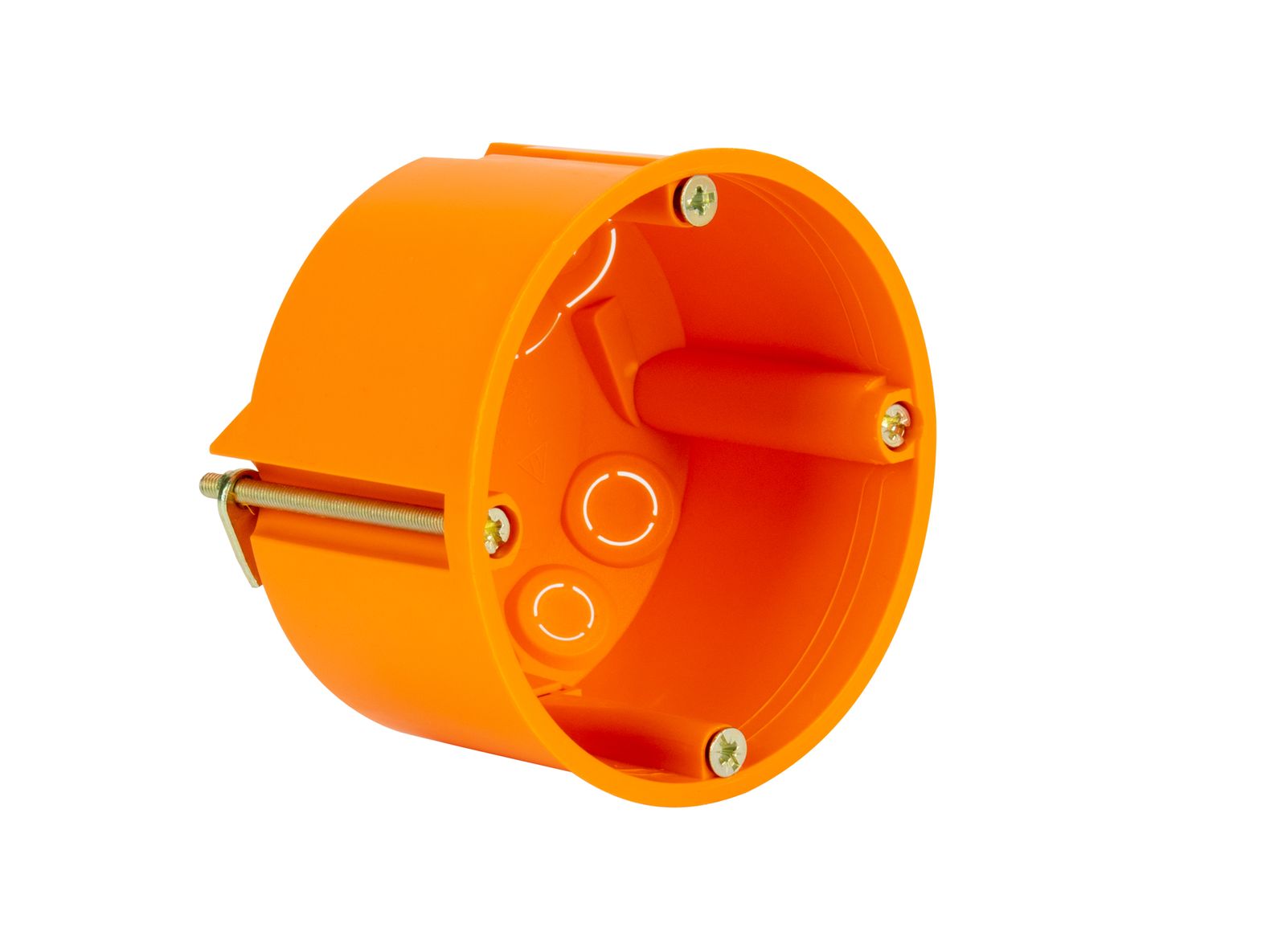Gerätedose O-range , Tiefe 49 mm (9063-02). Die neuen KAISER Hohlwand Installationsdosen mit bewährter Laschen-Befestigungstechnik und verbesserten Produktmerkmalen. Eine praxisgerechte Bauform und eine gezielte Auswahl an Leitungs- und Rohreinführungen ermöglichen eine Vielzahl an Nutzungsmöglichkeiten. Zusätzliche Dosen für Sonderanwendungen wie den Einbau in dünn beplankte Wände oder Wände aus Massivholz runden das vielfältige Sortiment ab. Die VDE Zertifizierung dokumentiert dabei den hohen Qualitätsanspruch. Tiefe: 49 mm | Fräsloch Ø: 68 mm
