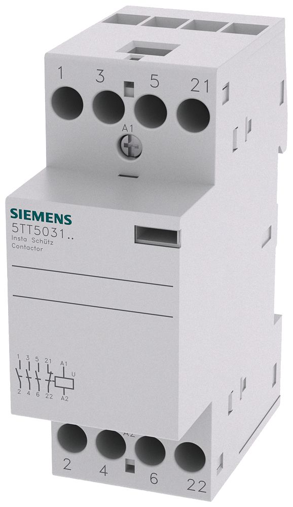 Insta-Schütz mit 4 Schließern Kontakt für AC 230V, 400V 25A Ansteuerung AC 230V Insta-Schütz SENTRON 5TT5 für Anwendungen im Wohn- und Zweckbau sowie für industrielle Anwendungen. Die SENTRON Schaltgeräte bieten komfortable und einfache Montage- und Anschlusstechnik sowie zuverlässige Sicherheit bei der Installation dank standardmäßigem Berührungsschutz. Mit den Fernschaltern, Schaltrelais, Insta-Schützen und Zeitschaltuhren haben Sie zahlreiche Möglichkeiten zur Realisierung diverser Schaltfunktionen. Für die SENTRON Schaltgeräte steht Ihnen umfangreiches und problemlos montierbares Zubehör zur Verfügung. Optimale Technik für Ihre Sicherheit - nur von Siemens.