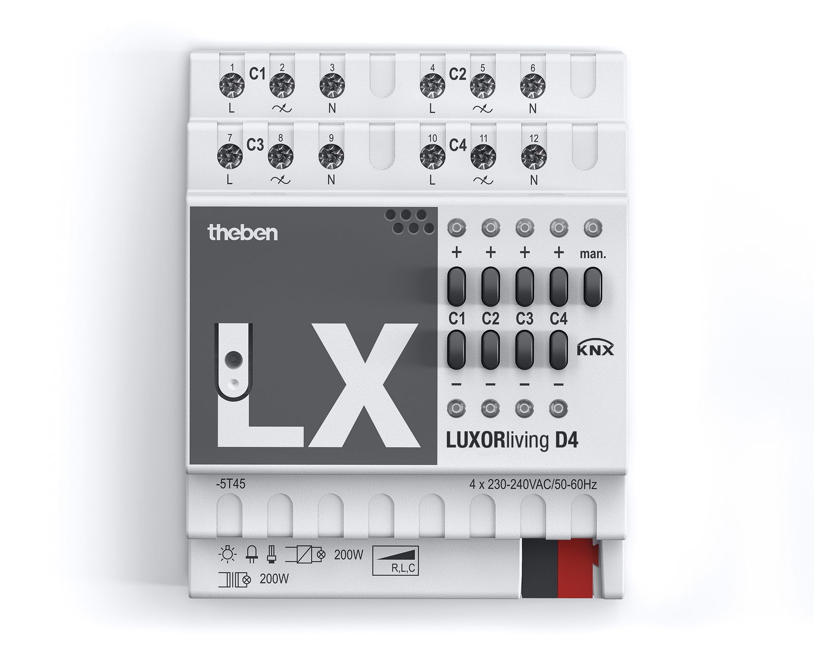 Jalousieaktor für das Smart Home System LUXORliving, 8-fach Antriebssteuerung, Relaisausgänge für 4 Antriebe, z. B. für Jalousien, Rollladen, Markisen, manuelle Bedienung am Gerät, Schlupfkorrektur, Antrieb frei parametrierbar, Handschalter AUF/AB und LEDs, 4 Schließer