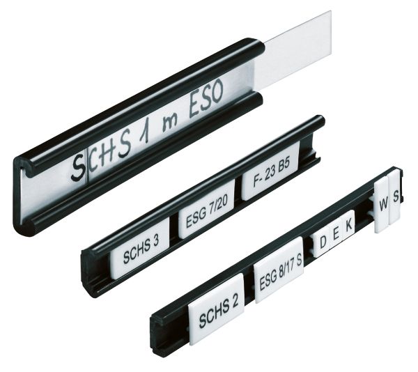 Markierer für die Kennzeichnung von Betriebsmitteln. Die Markierer können mit einem Drucker oder Plotter und entsprechender Software beschriftet werden.
