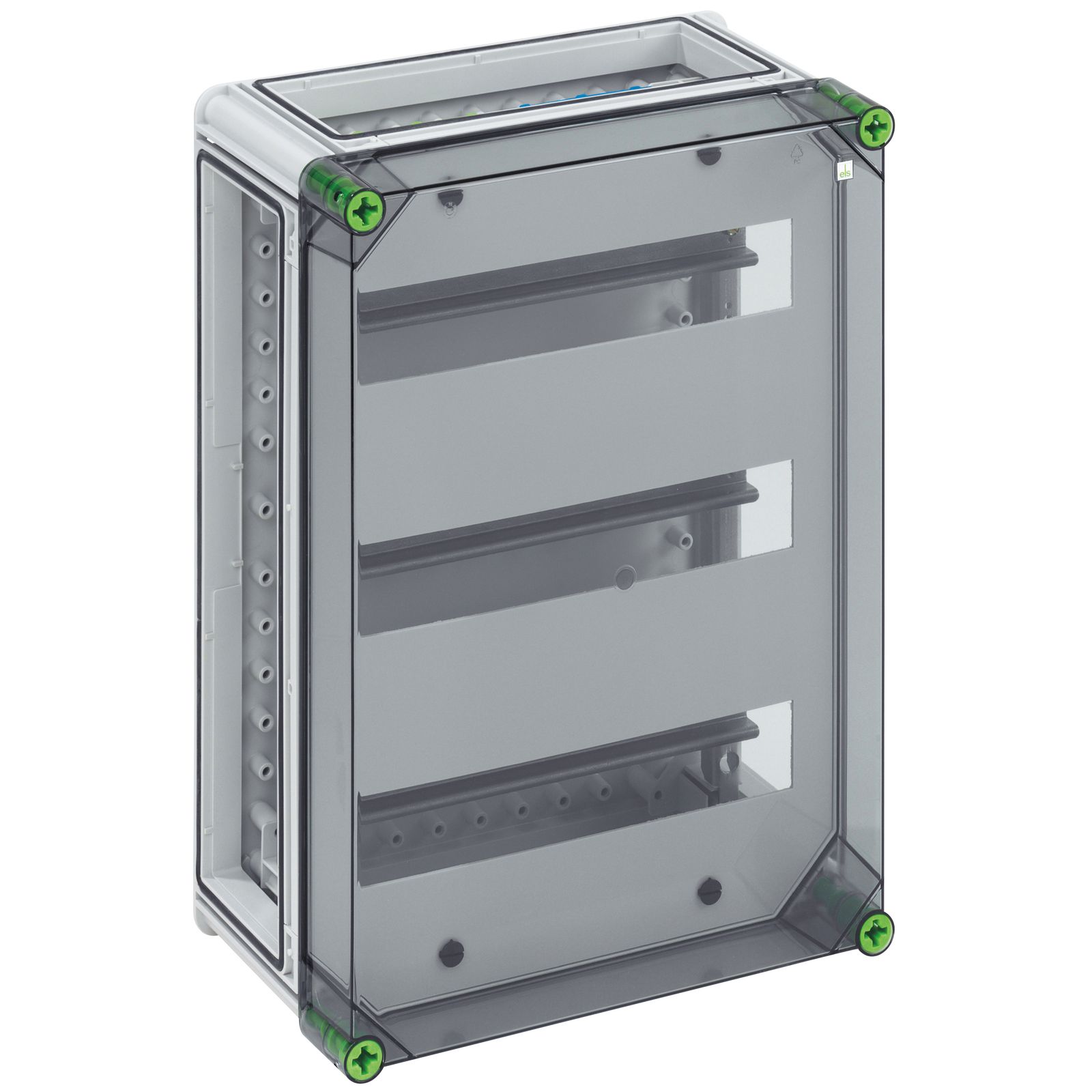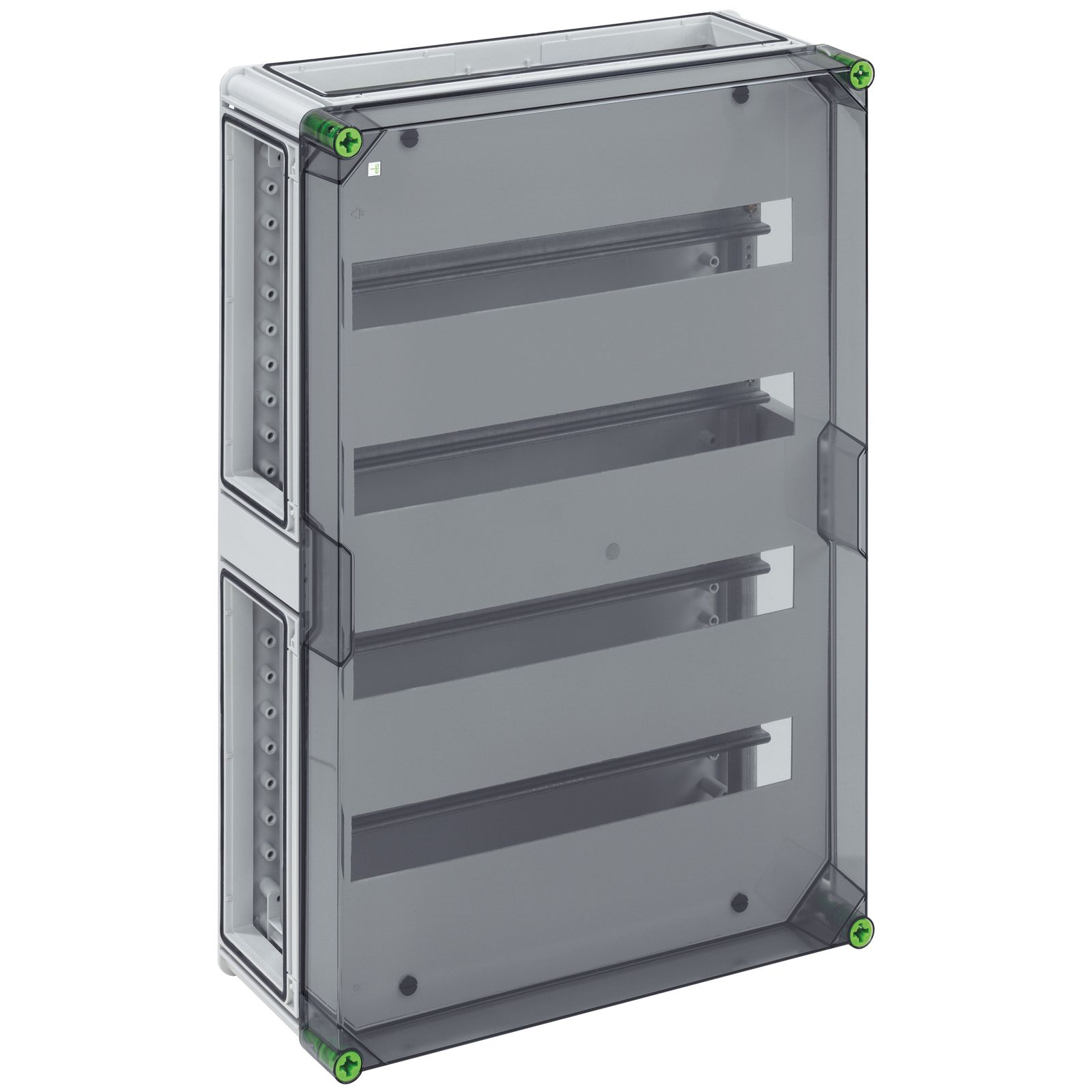 Automatengehäuse, 4-reihig, PE/N Klemme, mit jeweils 2 Klemmstellen 16mm², 10 Klemmstellen 6mm², Abdeck- und Beschriftungsstreifen, 4 x Gehäuseverbinder (GGV), mit transparentem Deckel Abmessungen: 320 x 640 x 179mm