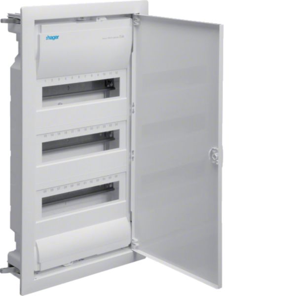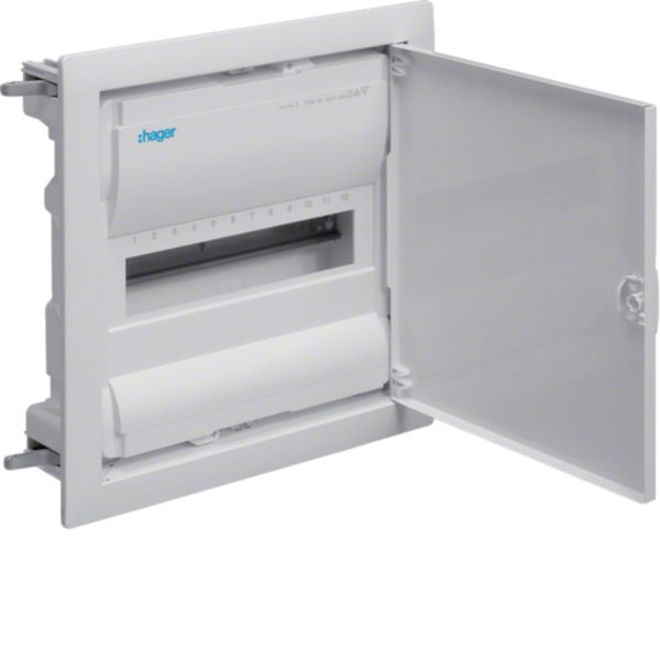 Kleinv. Volta HWV 2x12PLE IP30 Stahlblechtür.Installationskleinverteiler Hohlwand aus Kunststoff, nach DIN VDE 60670-24 und DIN 43871, geeignet zum Einsatz in Wohngebäuden nach DIN 18015. Zum Einbau von Geräten bis 63 A mit 70 mm Einbautiefe nach Maßnorm DIN 43880, Bemessungsspannung 400V/50Hz. Schutzart IP30, Schutzklasse II schutzisoliert. Bestehend aus: Kunststoff-Mauerkasten mit serienmäßigem Leitungsabfang und ausbrechbaren Leitungseinführungsschiebern mit Schnappbefestigung sowie integrierter Wasserwaage. Hohlwandbefestigung mit Schnellfixierungshebel, seitlich oder oben/unten montierbar. Geräteträger aus verzinktem Stahlblech, Hutschienen einzeln isoliert einbaubar. Geräteabdeckung aus Kunststoff mit 46 mm Geräteschlitz, Schnellverschlussbefestigung mit 90° Drehung, serienmäßig plombierbar. Verdrehbarer Blendrahmen mit Tür aus Stahlblech, pulverbeschichtet und eingebrannt, mit 15 mm Putzausgleich. Tür, frontbündig mit innenliegenden handbedienbaren Scharnieren. Türverschluss mit frontbündiger Griffmulde und selbsttätig zurückklappendem Griff, Türanschlag rechts oder links ohne Blendrahmendemontage. Serienmäßige Schaltplanbefestigung in der Tür und sowie integrierter seitlicher