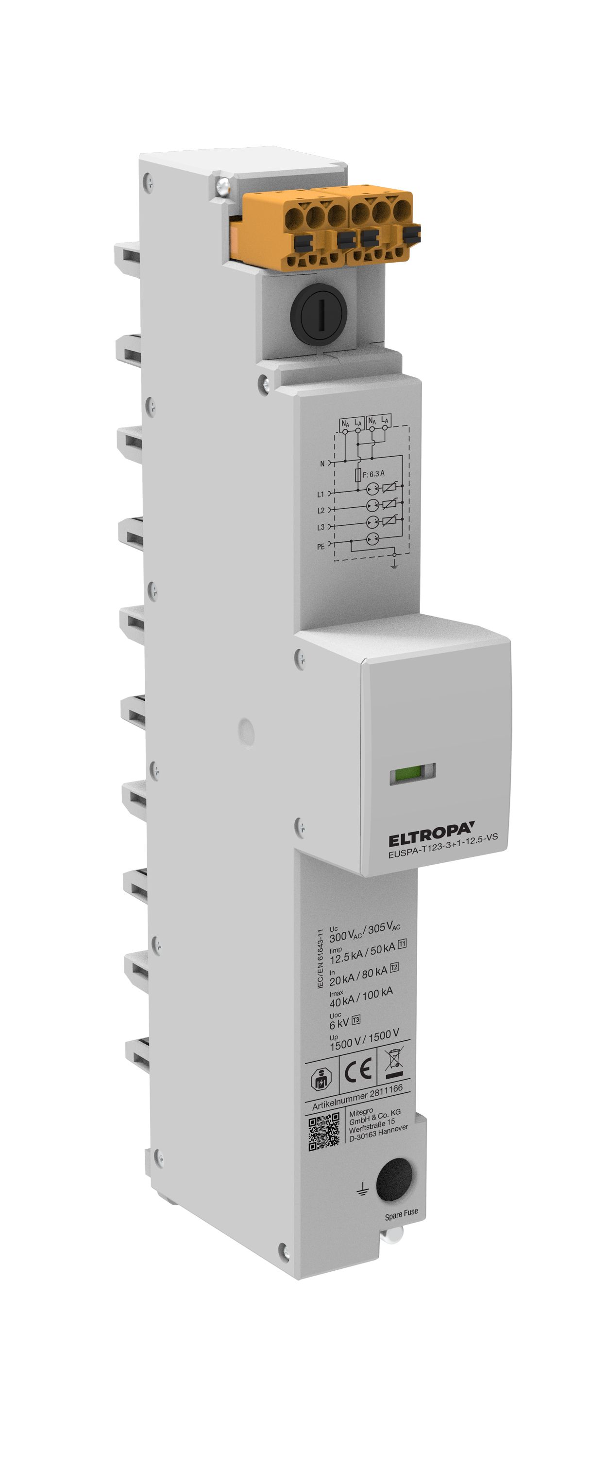 Kombi-Ableiter Typ 1 + Typ 2 + Typ 3 nach DIN EN 61643-11 zum Einsatz im Vorzählerbereich, für Gebäude ohne äußerem Blitzschutz. Montierbar auf dem 40mm-Sammelschienensystem, leckstromfrei, geeignet für Netzform TN-S/TT, schmales Design. Kompatibel mit Einspeiseklemme EUSPA-ESPK40 und Anschlussleitung EUSPA-KS40. Nennspannung 240V AC, Schutzpegel 1,5kV, Blitzstoßstrom (10/350 µs) 7,5kA (L-N), Nennableitstoßstrom (8/20 µs) 20kA (L-N), mit integrierter Vorsicherung.