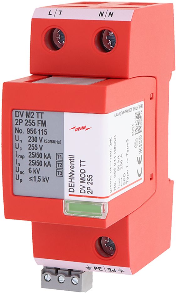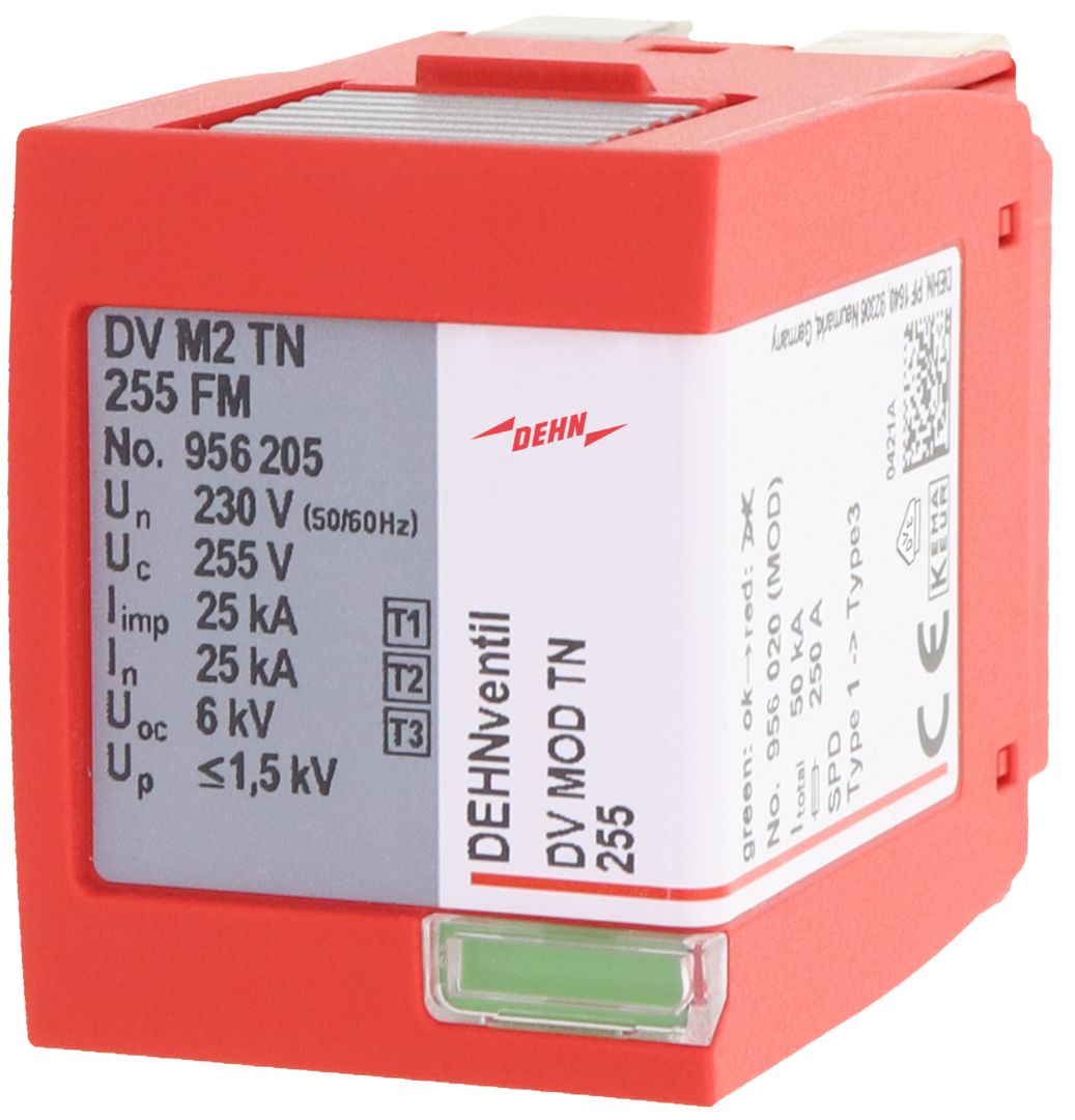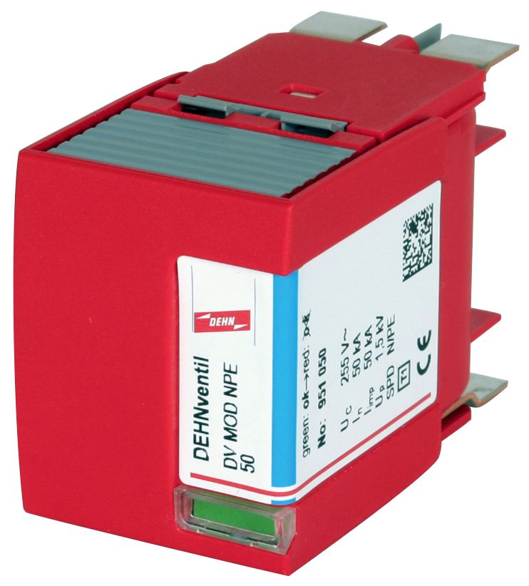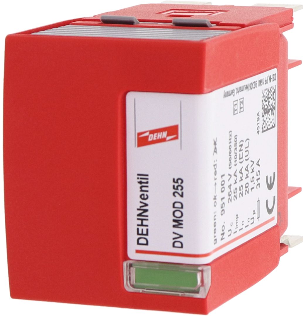 Mehrpoliger Kombiableiter DEHNventil modular, Typ 1 + Typ 2 + Typ 3 nach EN 61643-11 auf Funkenstreckenbasis, bestehend aus einem Basisteil und einem gesteckten Schutzmodul. Höchste Anlagenverfügbarkeit durch Rapid Arc Control (RAC) Funkenstrecken. Ermöglicht Endgeräteschutz. Zum Schutz von Niederspannungs-Verbraucheranlagen vor Überspannungen, auch bei direkten Blitzeinschlägen. Einsetzbar nach dem Blitz-Schutzzonen-Konzept an den Schnittstellen 0A 2.
