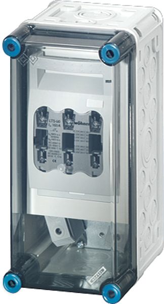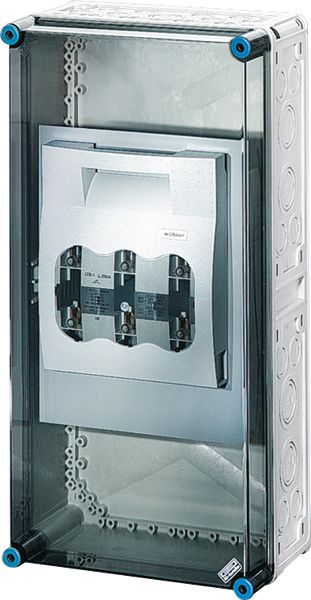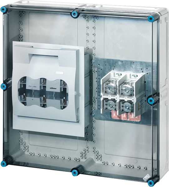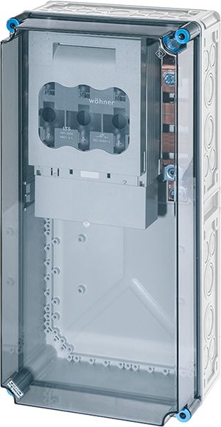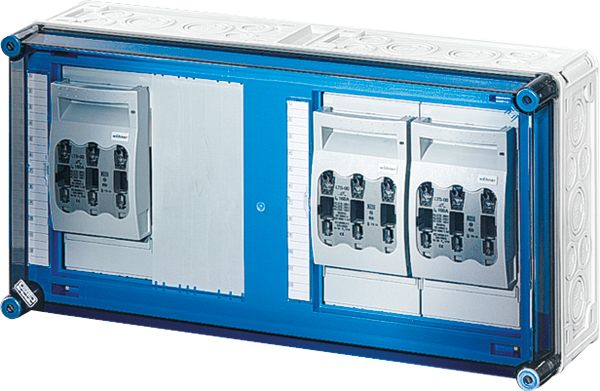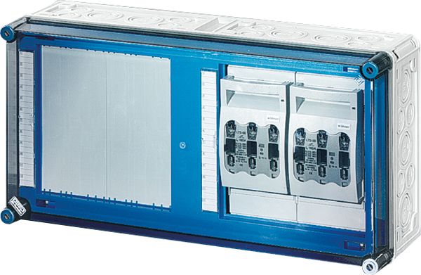 Gehäuse für den Bau von Energie-Schaltgerätekombinationen bis 630 A oder als Einzelgehäuse. Aus hochwertigem Polycarbonat schutzisoliert. Wanddurchführungen mit großen Öffnungen für die elektrische Verbindung der Gehäuse untereinander. Kabeleinführung an allen Gehäusewänden über metrische Vorprägungen oder Anbauflansche. Gehäuse zur Wandbefestigung auch über Außenlaschen oder mit Montageschienen. Gehäuse mit Sicherungslasttrennschalter NH 1, 3-polig, nach IEC 60947-3 auf Montageplatte. Mit PE- und N-Klemmen für Kupferleiter. Deckelverschlüsse für Werkzeugbetätigung.