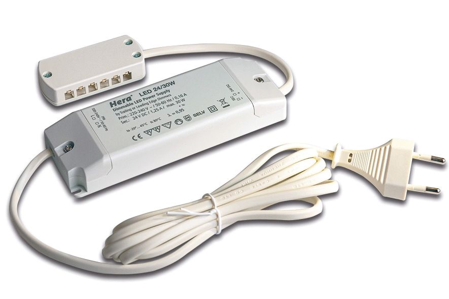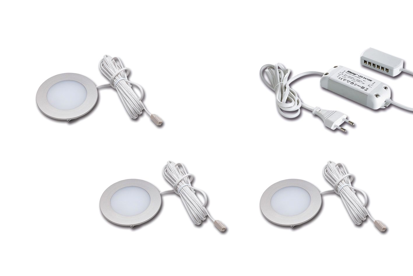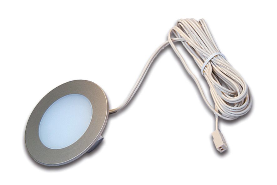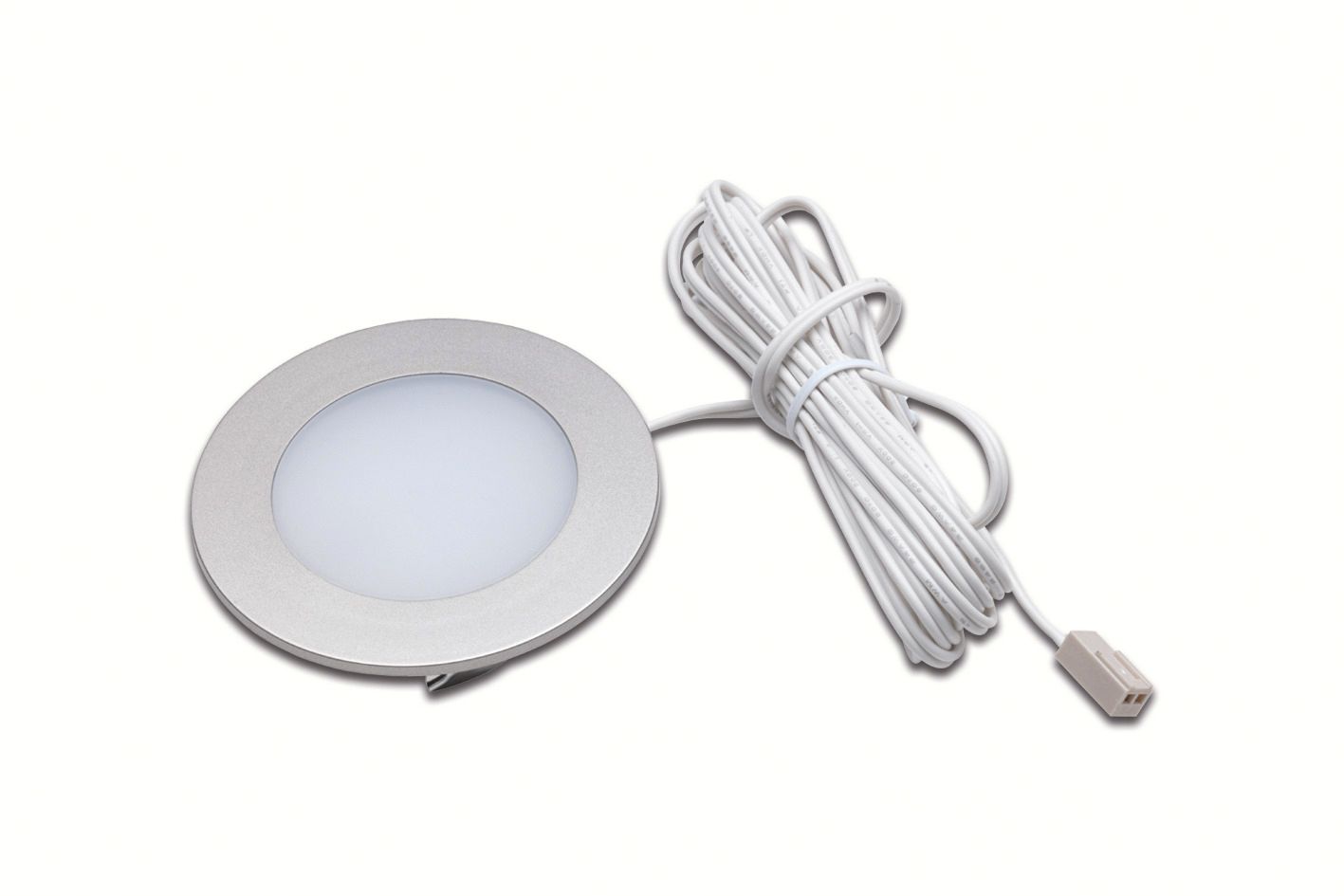 LED-Einbaustrahler mit Flächenlicht, Gehäuse Kunststoff, Anschlussleitung 2,5m mit LED 24-Stecker, Lichtfarbe warm weiß ca. 3000K, schnelle und einfache Montage durch Rasthaken, optionales Zubehör: Dimm-Controller mit Funkfernbedienung, WiFi App, DALI oder 1-10V Dimmer, Aufbauring für die Montage ohne Einbaubohrung