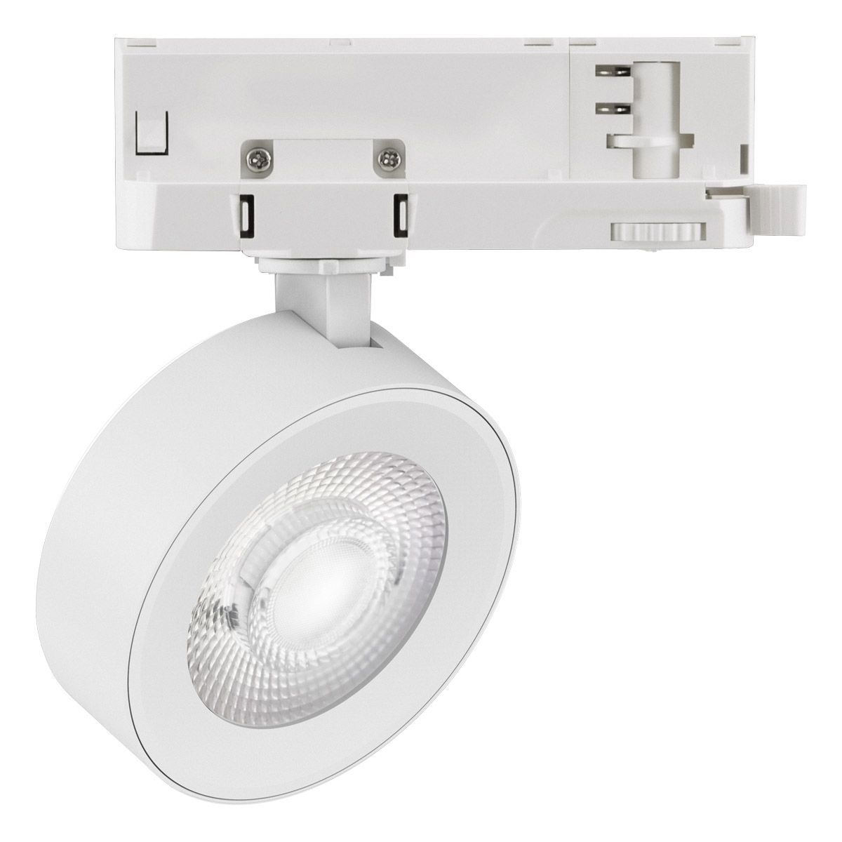 LED Schienenstrahler für vielfältige Anwendungen im Innenbereich. Sowohl Effektbeleuchtungen, Raumbeleuchtung, akzentuierte Beleuchtung und vieles mehr, lassen sich mit dieser Leuchte umsetzten. Das Netzgerät ist im Leuchtenkörper verbaut, somit wird hierfür kein zusätzlicher Platz benötigt. Mit dem rückseitig angebrachten Schalter kann eine von drei möglichen Farbtemperaturen(3000K,4000K,5000K) eingestellt werden. Außerdem kann die Leistung (15W,20W,25W) über einen Dip-Schalter eingestellt werden. Die möglichen Farbtemperaturen und daraus resultierenden Lumen unter Berücksichtigung der einstellbaren Wattage sind: 15W: 3000K (1440lm), 4000K (1680lm) und 5000K (1515lm), 20W: 3000K (1920lm), 4000K (2240lm) und 5000K (2020lm), 25W: 3000K (2400lm), 4000K (2800lm), 5000K (2525lm). Die Leuchte lässt sich um 350° drehen und auf eine Seite schwenken, mit einem Schwenkwinkel von 90°. Die Farbe entspricht ähnlich RAL9016. Die Leuchte ist inklusive Adapter für 3-Phasen-Schienen. Kompatible 3-Phasenschienen: Global, Eutrac, Nuco, Ivela, Staff, Norlux,