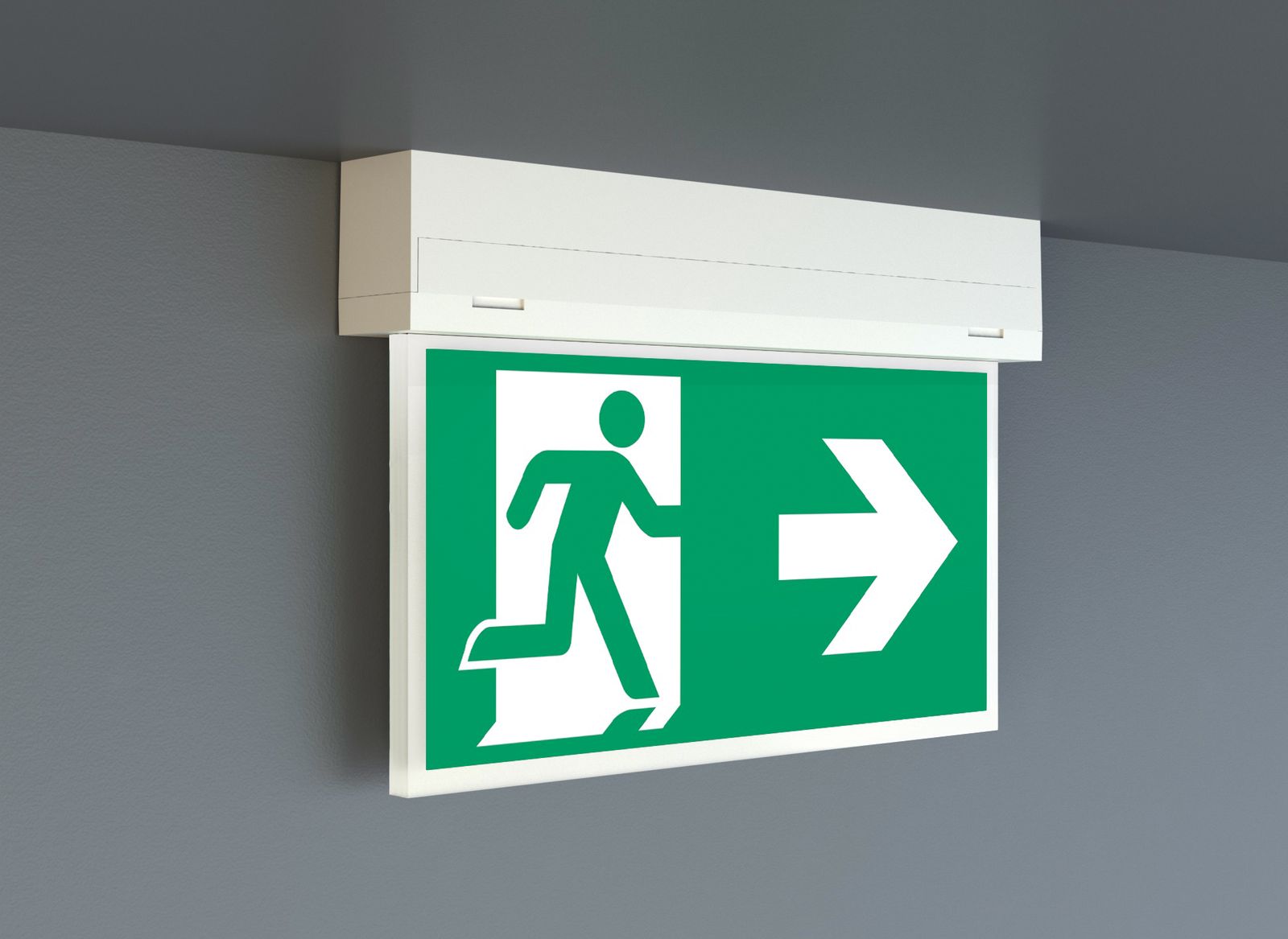 Leuchte zur Rettungswegkennzeichnung. Gehäuse Aluminium-Strangpressprofil pulverbeschichtet. 4 Rettungszeichenfolien und 1 weiße Folie inklusive Befestigungs-Pins zum Aufstecken beigelegt. Universal Befestigungssatz für Decken, und Wandanbau. Betriebsgeräte integriert. Einzelbatteriesystem mit automatischem Selbsttest. Mit Programmierschnittstelle NFC.