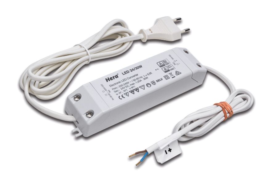 LED Betriebsgerät mit 24 V Gleichspannung (DC). Primär: Schraubklemme. Sekundär: RST-Buchse. Eingangsspannung: 220-240 V AC, Ausgangsspannung: 24 V DC.