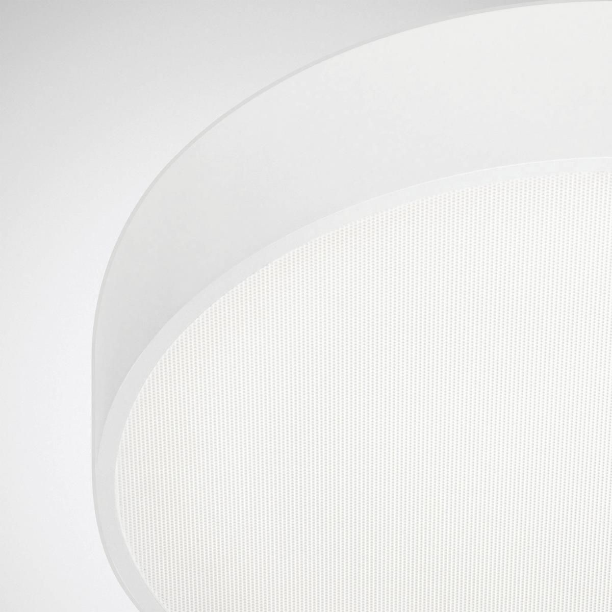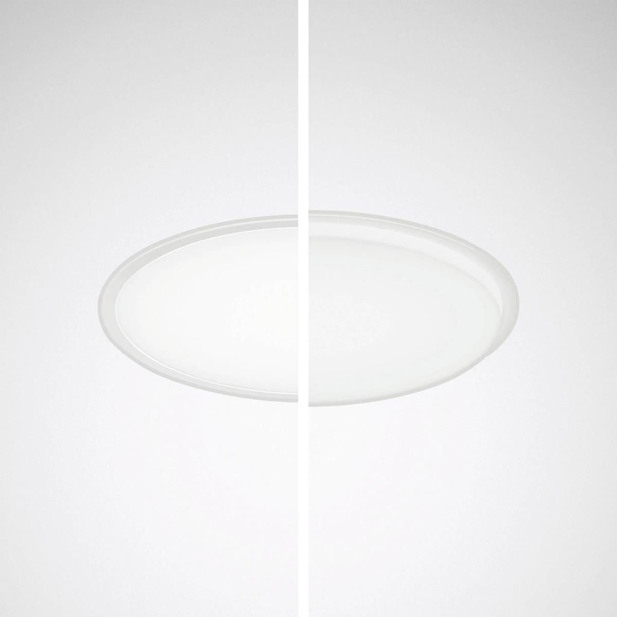 Runde LED-Deckenleuchte in geradliniger, zylindrischer Bauform. Durch einen optionalen, farbigen Profilrahmen (ZP) kann die Mantelfläche der Abdeckwanne individualisiert werden. Zur Deckenmontage sowie abgehängten Montage über optionales Zubehör geeignet. Die Befestigung der Abdeckung mit dem Leuchtenkörper erfolgt mittels einfach zu bedienender Bajonettverschlusstechnik mit Verdrehsicherung. Mit einer zylindrischen Abdeckwanne aus transluzentem PMMA. Mit lambertscher Lichtstärkeverteilung. In Kombination mit dem optionalen Zubehör Profilrahmen + CDP-Scheibe (ZP..CDP - ) ist die Anwendung als Deckenleuchte bildschirmarbeitsplatzgerecht gemäß EN 12464-1. Leuchtenlichtstrom und Lichtfarbe fest eingestellt. Bemessungslichtstrom 12800 lm, Bemessungsleistung 89 W, maximale Leuchten-Lichtausbeute 144 lm/W. Lichtfarbe warmweiß, ähnlichste Farbtemperatur (CCT) 3000 K, allgemeiner Farbwiedergabeindex (CRI) Ra > 80. Farborttoleranz (initial MacAdam) = 3 SDCM. Mittlere Bemessungslebensdauer L80 (tq 25 °C) = 50.000 h. Die Lichtquelle ist entsprechend der Ökodesign-Anforderungen (VO (EU) 2019/2020) austauschbar. Flimmern: Pst LM = 1,0 bei Volllast. Stroboskop-Effekt: SVM = 0,4 bei Volllast. Leuchtenkörper aus Stahlblech. Oberfläche weiß beschichtet (ähnlich RAL 9016). Durchmesser der Abdeckwanne Ø 900 mm, Leuchtenhöhe 121 mm. Schutzklasse (EN 61140): I, Schutzart (DIN EN 60529): IP20, Stoßfestigkeitsgrad nach IEC 62262: IK06, Prüftemperatur Glühdrahttest gemäß IEC 60695-2-11: 650 °C. Zulässige Umgebungstemperatur (ta): 25 °C Gewicht: 12,0 kg. Mit elektronischem Betriebsgerät, digital dimmbar (DALI). Betriebsgerät gemäß DALI-2-Standard (EN 62386). Das Betriebsgerät ist entsprechend der Ökodesign-Anforderungen (VO (EU) 2019/2020) austauschbar. Die Leuchte ist Monitoring ready (MOR) und liefert Leuchtendaten zur Überwachung oder vorausschauenden Wartung. Sie ist damit kompatibel zu den TRILUX Monitoring Services. Das Produkt erfüllt die grundlegenden Anforderungen der anwendbaren EU-Richtlinien und des Produktsicherheitsgesetzes und trägt die CE-Kennzeichnung. Zusätzlich ist die Leuchte durch eine unabhängige Prüfstelle ENEC-zertifiziert. Leuchte 10 Jahre, Ersatzteile (LED-Modul, Betriebsgerät, optisches System) 15 Jahre nach Rechnungsdatum unter Vorbehalt vertretbarer Änderungen, die