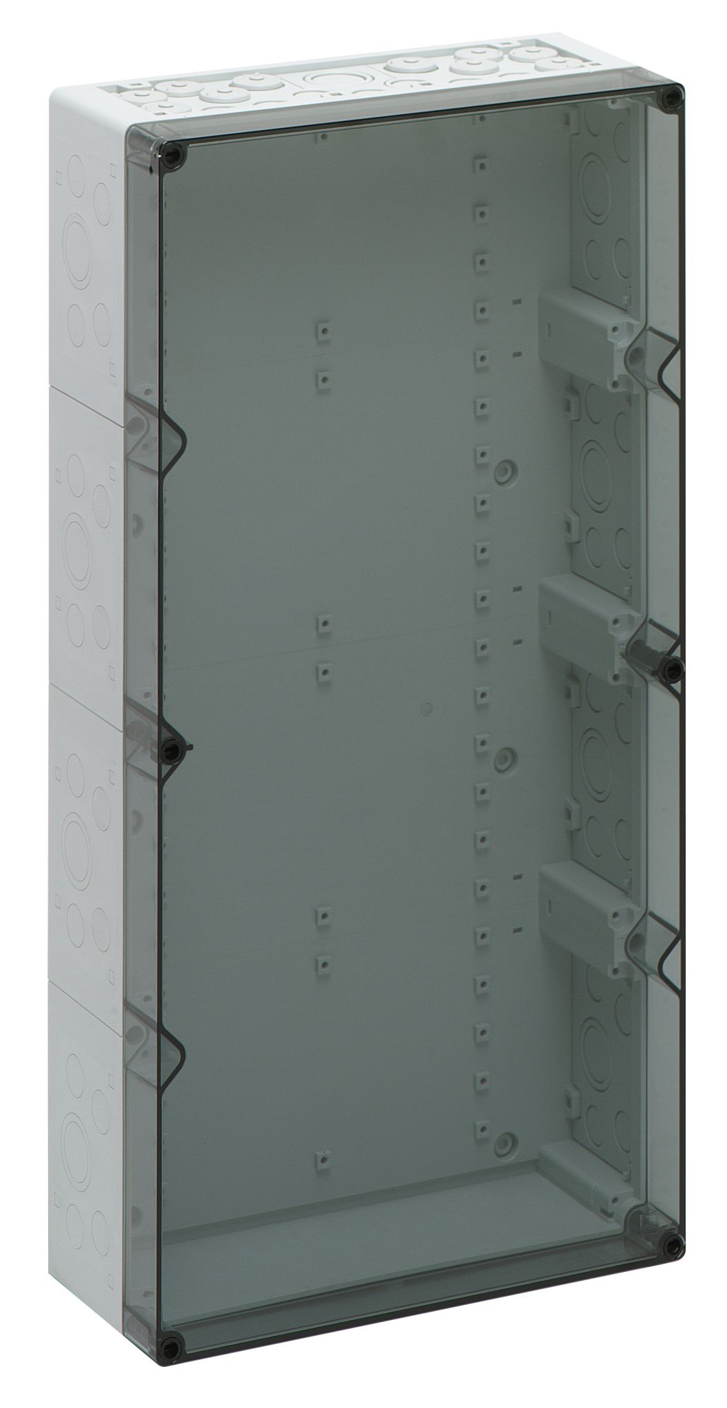 Leergehäuse, mit Schutzart IP65, Polystyrol, Ui=690V AC, Ui=1000V DC, innenliegende Befestigungsstellen, für Standardinstallationen im Innenbereich, Kasten: Polystyrol, Deckel: Polycarbonat, transparent, Ausschlagmembranen, M20/M25/M32/M40, (46 seitlich) Abmessungen: 300 x 150 x 132mm Beigefügtes Zubehör: 10 Doppelmembranstutzen IP66 M20 Dichtbereich 7-12mm, 2 Doppelmembranstutzen IP66 M25 Dichtbereich 9-16mm, 2 Doppelmembranstutzen M32 Dichtbereich 14-21mm, 1 Doppelmembranstutzen IP66 M40 Dichtbereich 19-28mm
