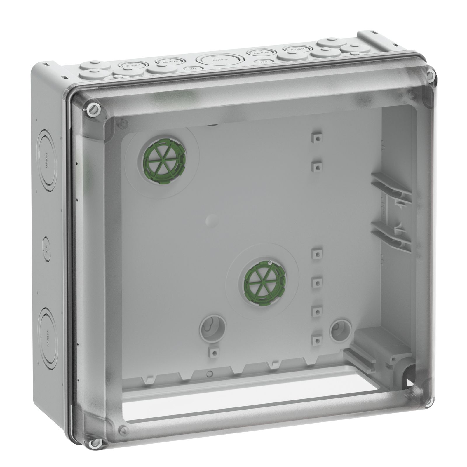 Leergehäuse, mit Schutzart IP65, Kunststoff, zertifiziert durch DLG (Ammoniakbeständigkeit), Ui=1000V AC, Ui=1500V DC, für Kleinverteiler AK 14-56 zum individuellen Ausbau mit Normschienen oder Montageplatte, Kasten: Kunststoff, grau, Deckel: Polycarbonat, grau, oben metrische Vorprägungen für universelle Leitungseinführungen mit Kabelverschraubungen und / oder Doppelmembranstutzen, oben mit elastischen Einführungen DMS M20 vorbestückt Abmessungen: 315 x 300 x 147mm Beigefügtes Zubehör: Doppelmembranstutzen: 1x M16, 5x M20, 2x M25, 1x M32, 1x M40, Verschlussstopfen, Abdeck- und Beschriftungsstreifen