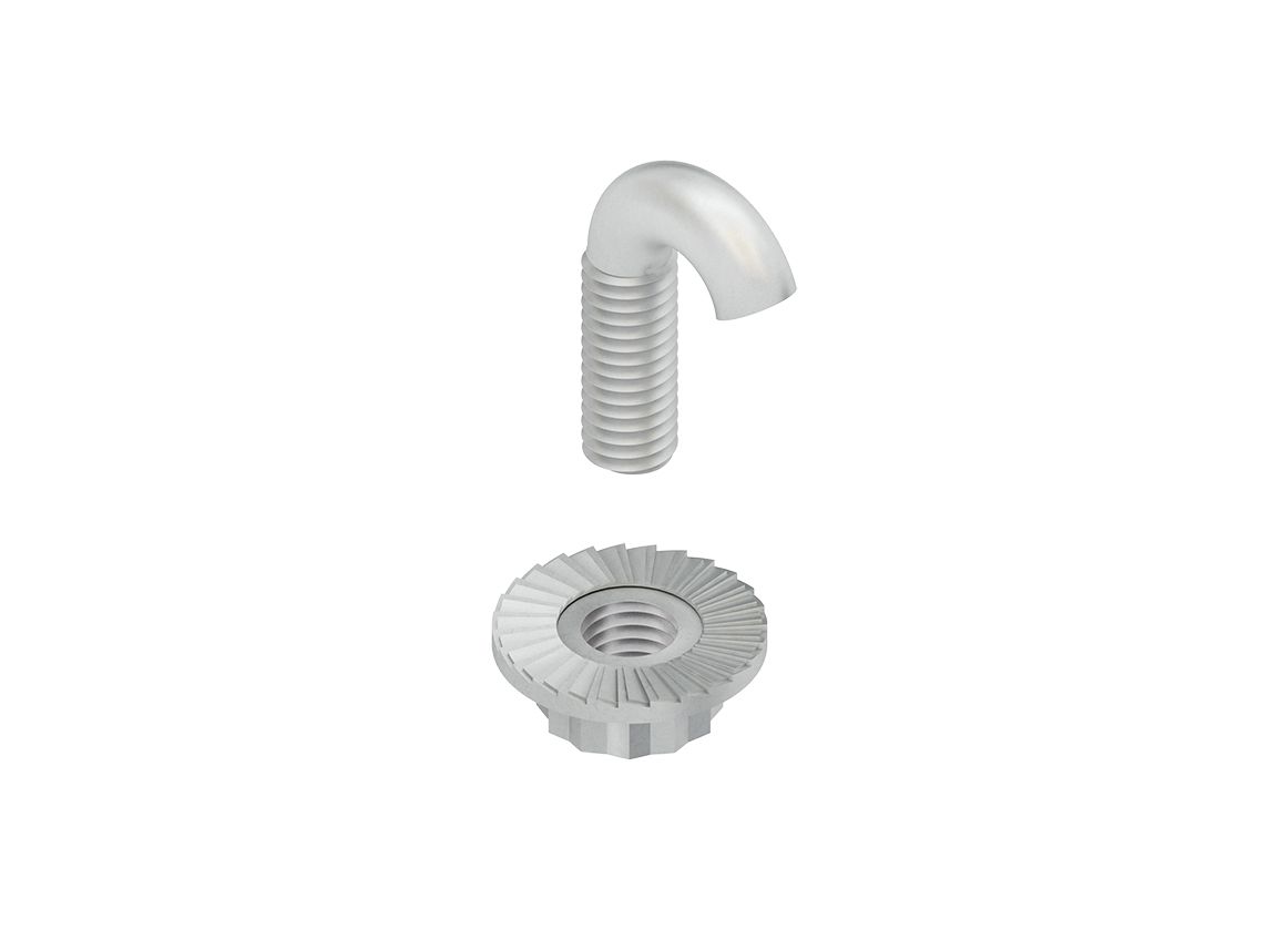 Hakenschraube mit Gewinde M 6, einschließlich verzahnter Sonderflanschmutter ähnlich DIN EN 1661, zur Befestigung der Gitterrinnen auf Ausleger, an Gitterrinnen-Hängestiele, sowie an Gelenkverbinder. Zur Verwendung im Funktionserhalt bitte Zusatzvorschriften beachten! Verwendbar für : Gitterrinnen bis max. 6 mm Drahtstärke Abmessungen (ca. Maße) Gewinde : M 6 Gewindelänge : 15 mm Flanschmutter : Ø 17 mm Werkstoff : Stahl, galvanisch verzinkt nach DIN EN ISO 4042, blaupassiviert.