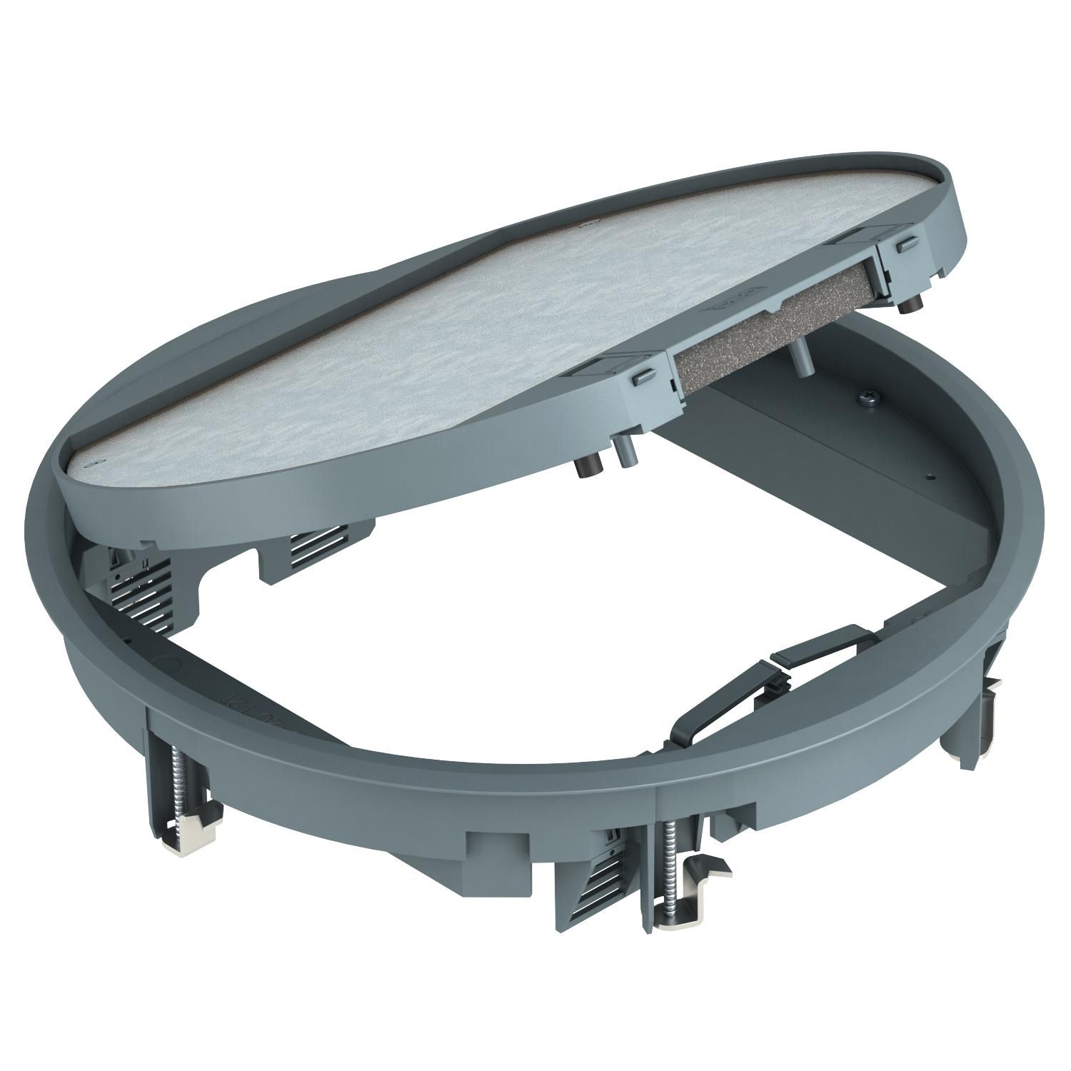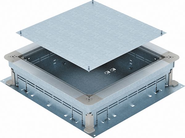 Montagedeckel für Unterflur-Zug- und -Abzweigdosen vom Typ UZD350-3/4 zum Einbau einer Einbaueinheit der Nenngröße R9. Einbauöffnung 3 mm vertieft zum nachträglichen Blindverschluss mit Deckelblindplatte.