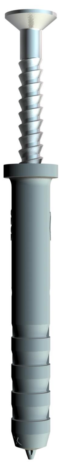 Nageldübel aus Polyamid, grauweiß RAL 9002, halogenfrei. Zur Verwendung in Vollbaustoffen wie Beton, Ziegel und zur Montage von leichten Armaturen. Vormontierte, galvanisch verzinnte PZ Kreuzschlitz-Nagelschraube.