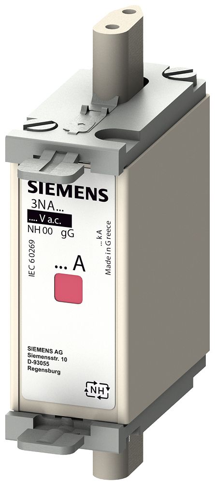 NH-Sicherungseinsatz, NH000, In: 80 A, gG, Un AC: 500 V, Un DC: 250 V, Kombikennmelder, isolierte Grifflaschen NH-Sicherungseinsatz SENTRON 3NA6 für den selektiven Leitungs- und Anlagenschutz. Das NH-Sicherungssystem bietet effektiven Personen-, Geräte- und Anlagenschutz durch sicheres Abschalten im Überlast- und Kurzschlussfall. Kombimelder signalisieren das Abschalten der Sicherung durch einen deutlichen Farbwechsel von rot nach weiß. Die NH-Sicherungseinsätze sind von 2 A bis 1250 A und in den Baugrößen 000, 00, 0, 1, 2, 3, 4 und 4a verfügbar. Die Varianten mit Kommunikations- und Messfunktion in der Baugröße 2 von 80 A bis 315 A. SENTRON Schutzschaltgeräte - Eine sichere