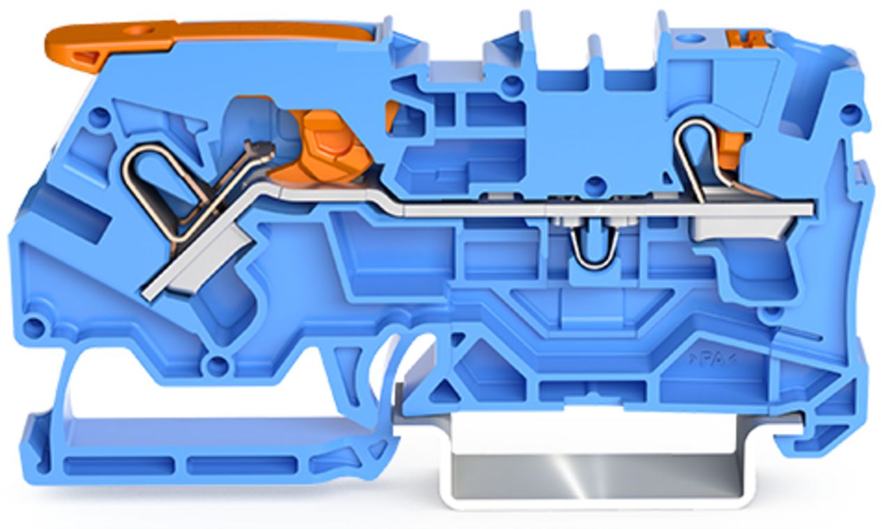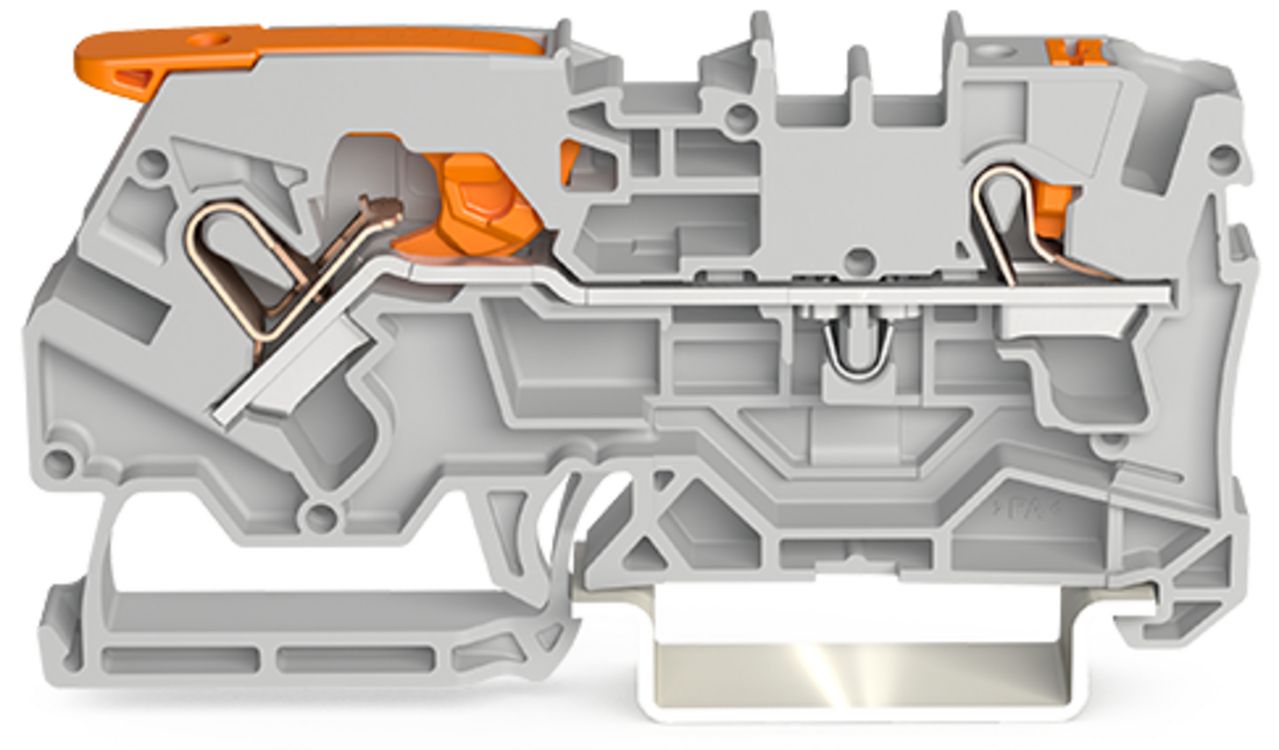 2-Leiter-Durchgangsklemme: mit Hebel und Drücker: 10 mm²: mit Prüföffnung: seitliche und mittige Beschriftung: für Tragschiene 35 x 15 und 35 x 7,5: Push-in CAGE CLAMP : 10,00 mm²: grau