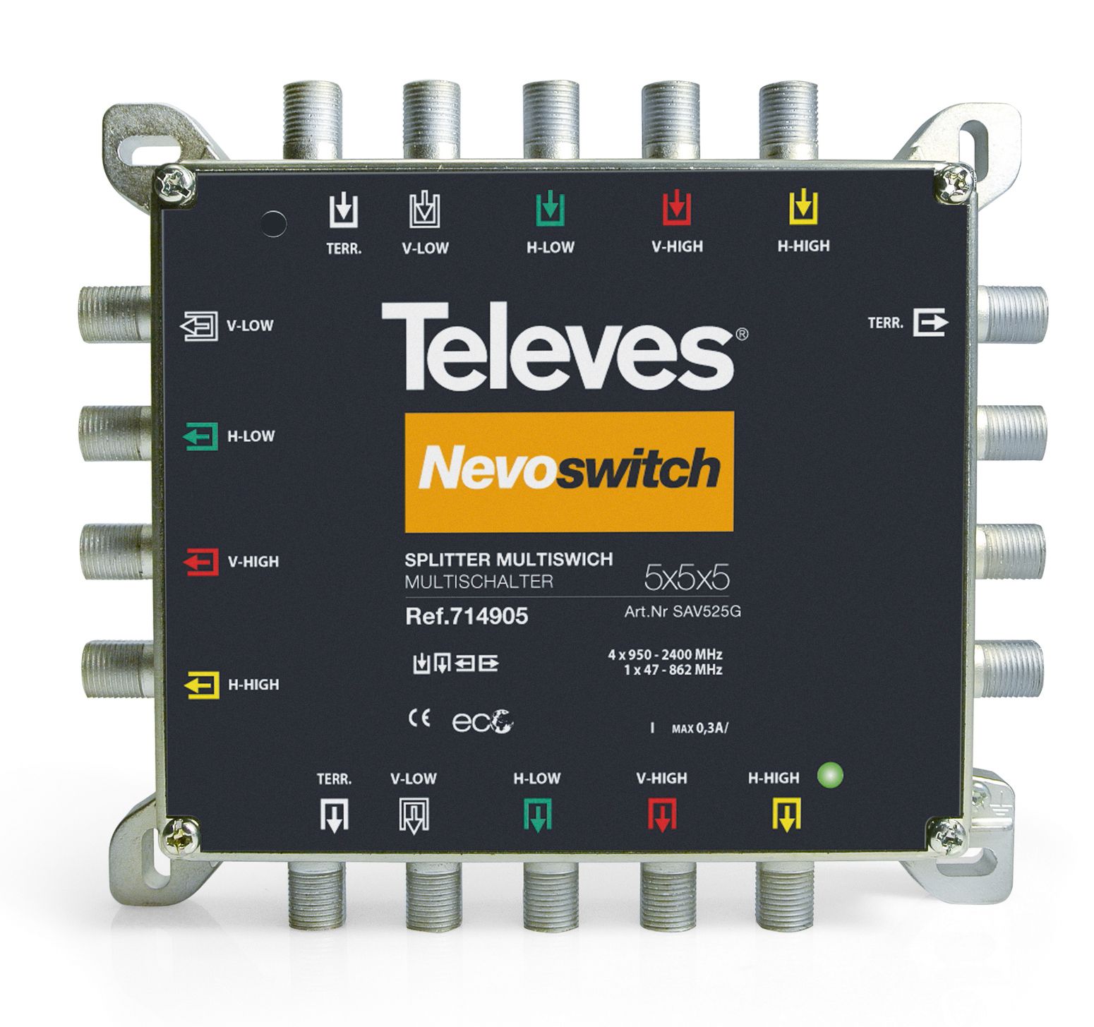 NevoSwitch Verstärker mit 5 Eingängen (1 x Terrestrik und 4 x SAT) zur Verstärkung der Signale, so dass die Teilnehmerzahl erhöht werden kann, bei gleichbleibend gutem Signal. Verstärkung im terr. Bereich 10 dB und im SAT-Bereich 11 dB.