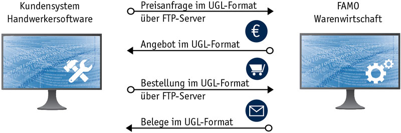 UGL steht für Übergabeschnittstelle lang und ist ein weitverbreiteter Standard zur Kommunikation zwischen Großhändler und Handwerk. Mithilfe der UGL-Schnittstelle kannst Du Dein digitales Tagesgeschäft einfach aus Deiner Handwerkersoftware heraus abwickeln. Deine Software kommuniziert direkt mit der FAMO-Warenwirtschaft über einen FTP-Server, dadurch kannst Du schnell und bequem Deine Projektanfragen und Bestellungen im UGL-Format senden.