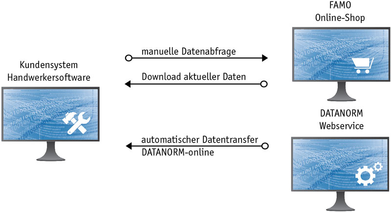 DATANORM-online ist ein komfortabler Webservice, der die Einspielung von DATANORM-Sätzen in Ihre Handwerker-/ Kalkulationssoftware automatisiert. Sie können schnell und einfach den FAMO-Artikelkatalog direkt per Klick aus Ihrer Software heraus starten und aktualisieren. Voraussetzung hierfür ist, dass Ihre Handwerkersoftware diesen Vorgang unterstützt.