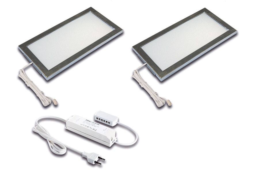 Dimm-Controller 24V DC mit beiliegender Anbau-Funkfernbedienung in edelstahloptik und Wandhalterung, mit Memory-Funktion (nach Netztrennung wird der vorherige Dimmzustand wieder hergestellt), inkl. Batterie, Anschlussleitung mit zwei LED 24-Steckern und 12-fach Verteiler für die Leuchten