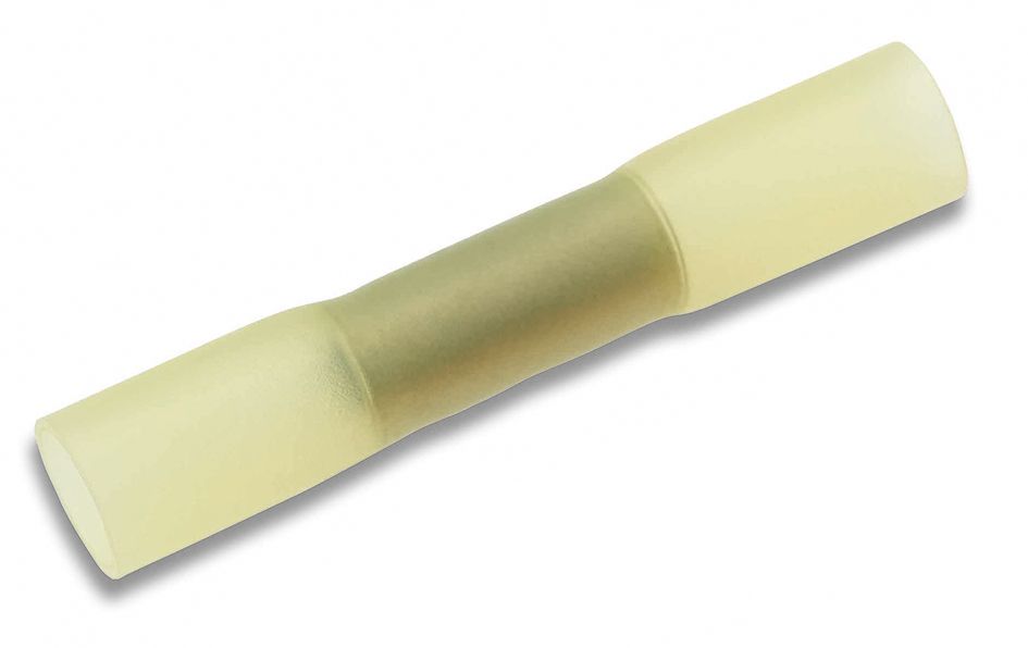 Stoßverbinder mit transparenter Schrumpfisolation. Technische Daten - Werkstoff: Cu-ETP DIN EN 13600. Oberfläche: galvanisch verzinnt, für zugentlastete Verbindungen, Isolation Polyolefin mit Innenbeschichtung aus Schmelzkleber. Schrumpftemperatur: +150°C, Temperaturbeständigkeit 10°C bis +105°C der Schrumpfung bildet der Schmelzkleber eine isolierende, alterungsbeständige, zugentlastende und wasserdichte Verbindung. Geeignet für fein- und mehrdrähtige Leiter.