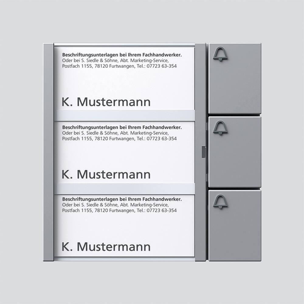 Tasten-Modul mit Namensschildtasche, 3 Namensschildern und 3 separaten Ruftasten mit Glockensymbol.