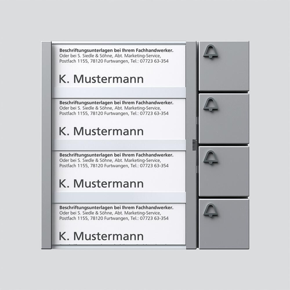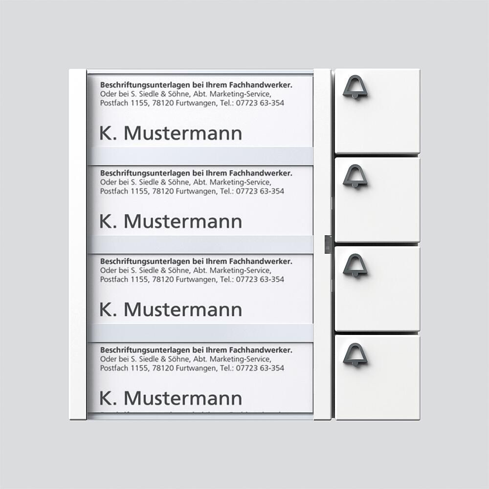 Tasten-Modul mit Namensschildtasche, 4 Namensschildern und 4 separaten Ruftasten mit Glockensymbol.