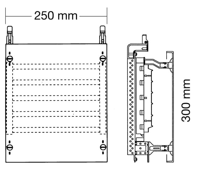 Innenausbau Modul, CombiLine, Bausatz unmontiert, für DIN Reiheneinbaugeräte, Rasteinheit 1 RE = 150 mm, Feldbreite 1 = 250 mm, 12 Platzeinheiten, Reihenabstand: 125 / 150, Ausbau mit Hutprofilschiene 35 x 15 mm mit Lochung für Drahthalter, für Einbaugeräte nach DIN 43880, Abdeckungen aus Kunststoff, 90 Grad Druck-Drehverschluss, RAL 7035, Ausführung der Abdeckung: mit Ausschnitt, einsetzbar ab einer Schranktiefe von 120 mm, EDF oder WR Montagegerüst muss separat bestellt werden