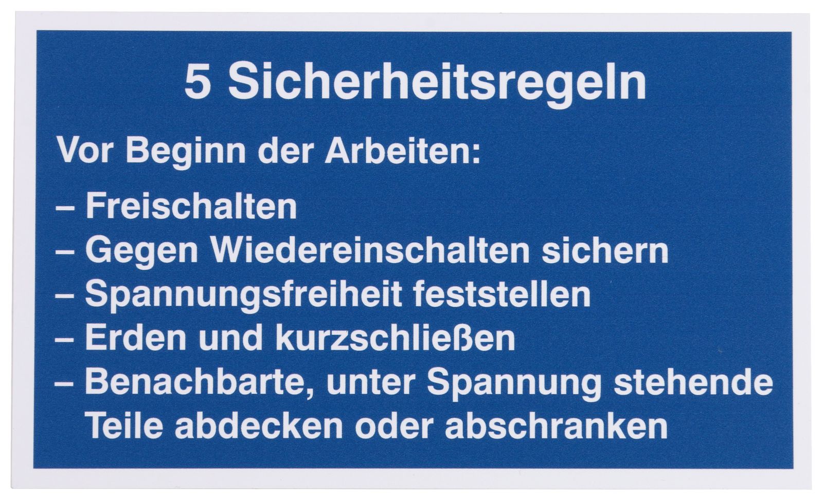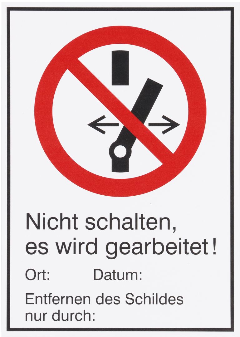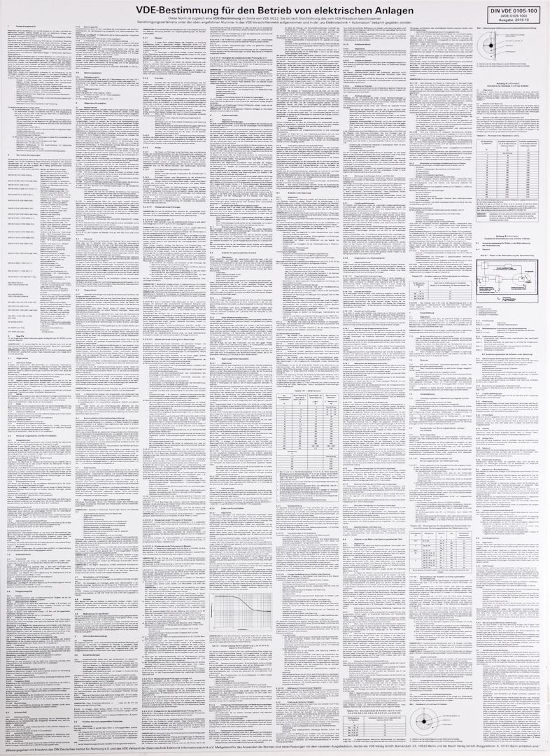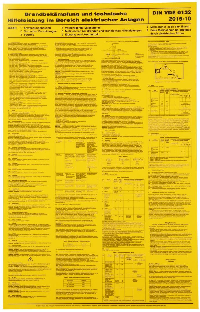 Kompletter Warn- und Hinweisschildersatz, zum Aushang und für Arbeiten an elektrischen Anlagen nach DIN VDE 0105-100 und Teil 1 (DIN EN 50110-1) mit folgender Bestückung: Aushang VDE-Bestimmungen für den Betrieb von elektrischen Anlagen, Aushang Erste Hilfe Aushang nach BGI 510, Aushang Brandbekämpfung und technische Hilfeleistung im Bereich elektrischer Anlagen, Verbotsschild Nicht schalten. Es wird gearbeitet, Warnschild Hochspannung Lebensgefahr, Warnschild Achtung! Geerdet und kurzgeschlossen!, Hinweisschild 5 Sicherheitsregeln